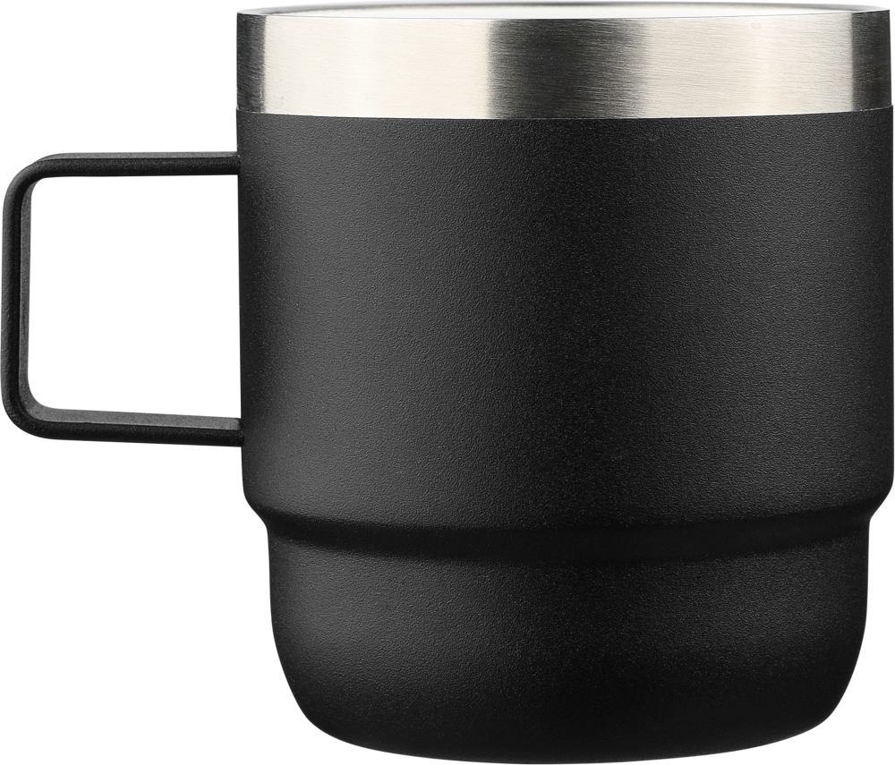 Hrnek z recyklované nerezové oceli (180 ml) s dvojitou stěnou, keramickým vnitřním povlakem, rukojetí a laserově gravírovaným logem z recyklované nerezové oceli. Baleno v hnědé kartonové krabici. Rozměry: 7,5 cm x 10 cm