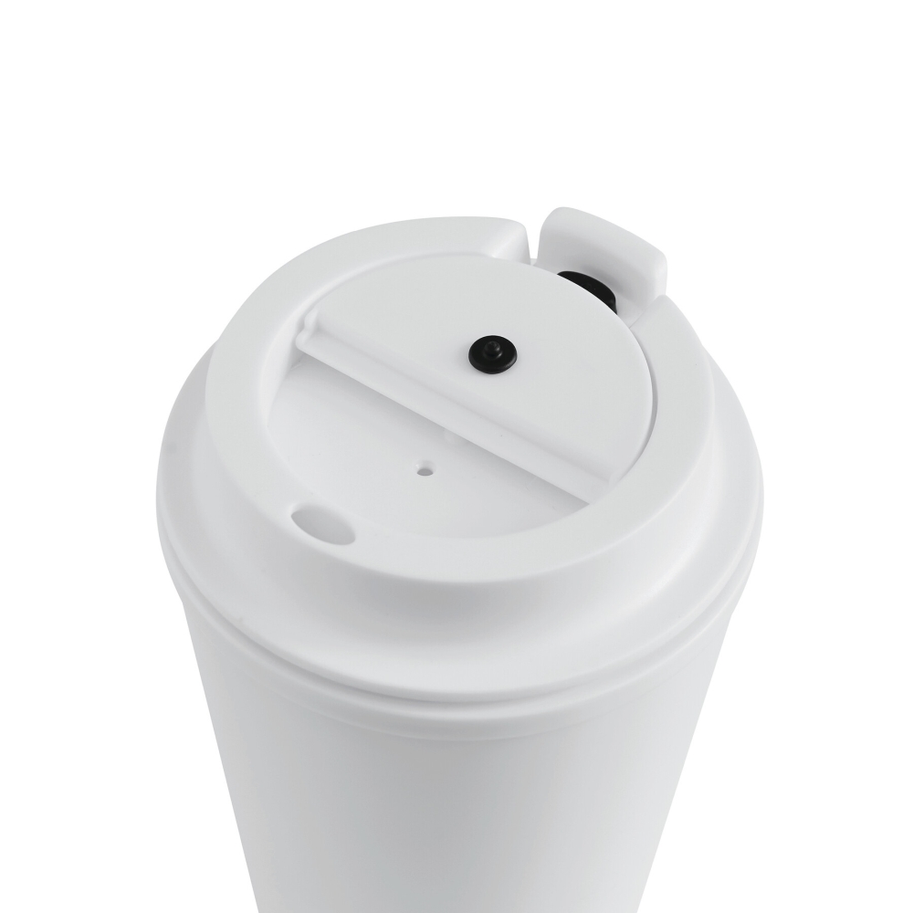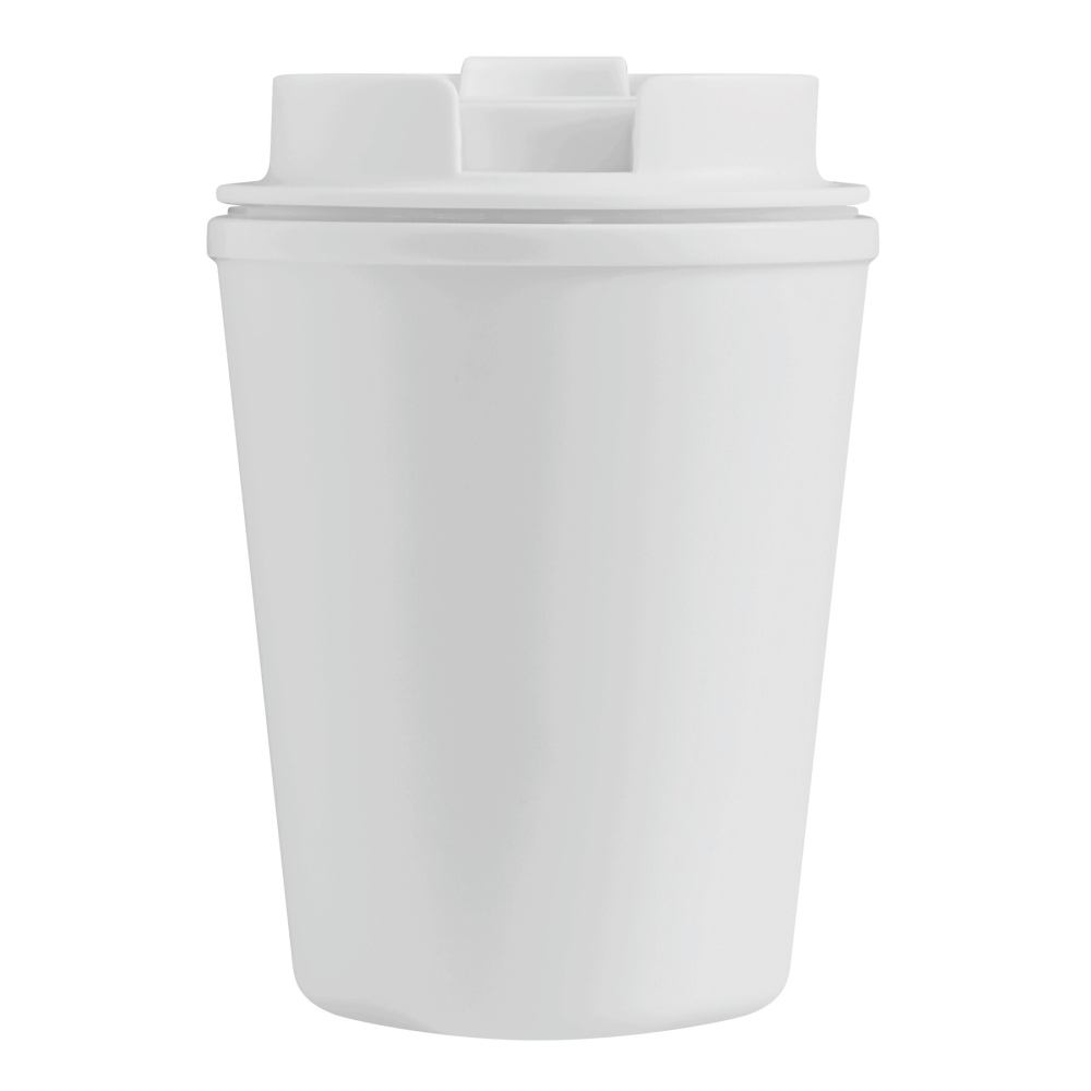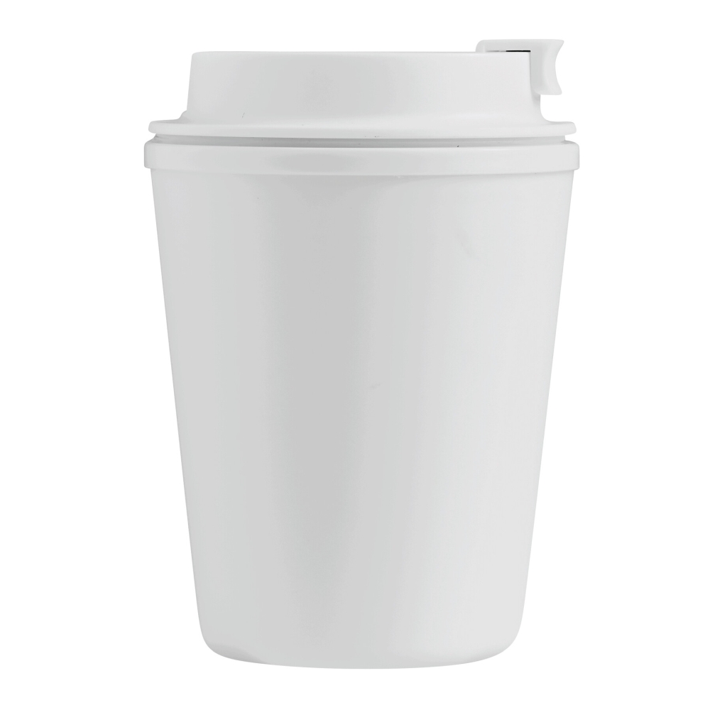Dvoustěnný izolovaný hrnek, uvnitř i vně z plastu, bezpečný šroubovací uzávěr se silikonovým těsněním a integrovaným výklopným otvorem pro pití, objem cca 350 ml, udrží teplé nápoje cca 2 hodiny a studené až 4 hodiny. Rozměry: O9,2 x 13 cm
