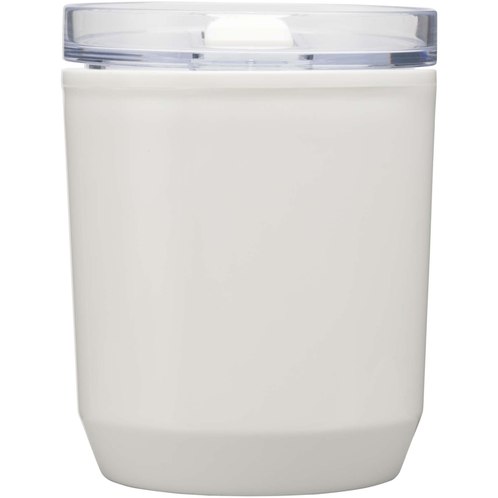 Hrnek s jednoduchým designem, která pasuje do většiny kávovarů a držáků nápojů v autě. Má konstrukci s dvojitou stěnou s vnějším povrchem z recyklovaného PP plastu a vnitřkem z PP plastu. Posuvné víčko je vyrobeno z AS a PP plastu. Objemová kapacita: 180 ml. Rozměry: 8,2 x 7,5 cm