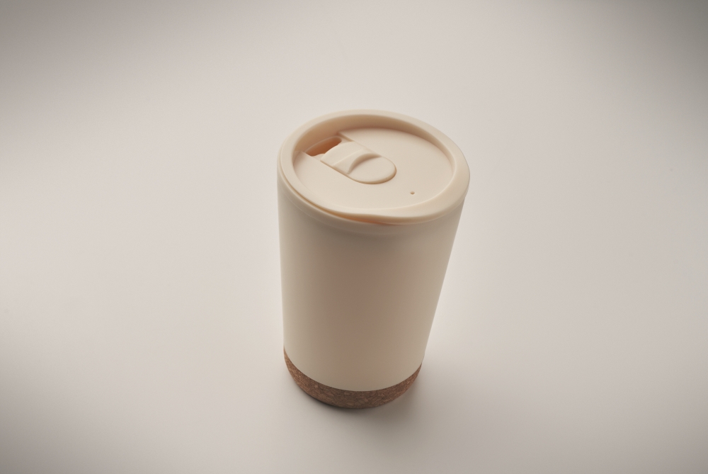 Dvoustěnný pohárek z PP s korkovým dnem a posuvným uzavíracím víčkem s náustkem z PS a ABS. Objem: 300 ml. Rozměry: O 8 x 12 cm