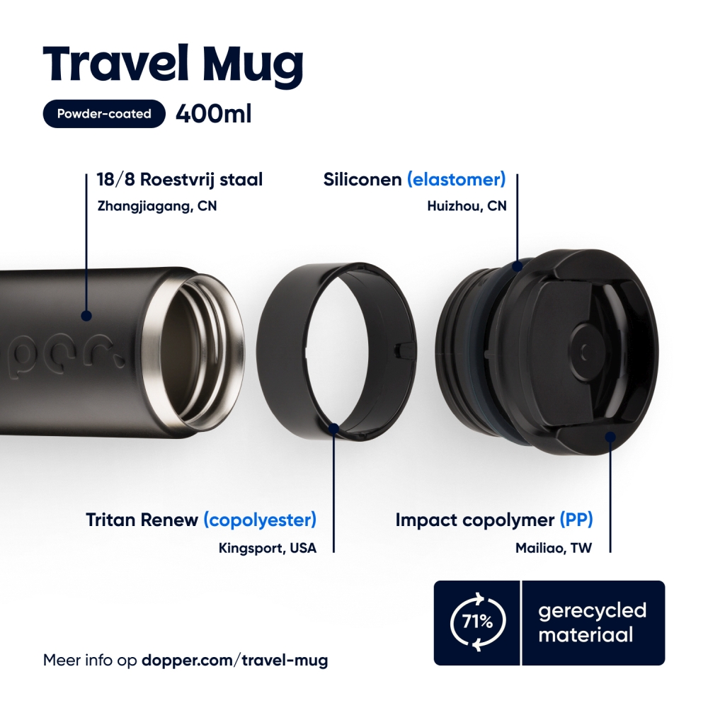 Ať už jde o ranní kávu, polední hydrataci nebo večerní perlivý nápoj, tento cestovní hrnek Dopper je stvořen pro vše. Udrží horké nápoje teplé až 6 hodin a studené nápoje chladné až 20 hodin. Hrnek má dvoustěnné tělo z nerezové oceli vyrobené z 90 % recyklované oceli a je opatřen odolným práškovým lakem. Snadno otevíratelný odklápěcí uzávěr usnadňuje a udržuje popíjení na cestách jednoduché a pohodlné. Vhodný do myčky nádobí (bez potisku) do 65 °C. Upozorňujeme, že při použití s ??čajem nebo kávou se mohou objevit skvrny nebo zápach. S horkými nápoji buďte opatrní. Rozměry: 7 x 15 cm