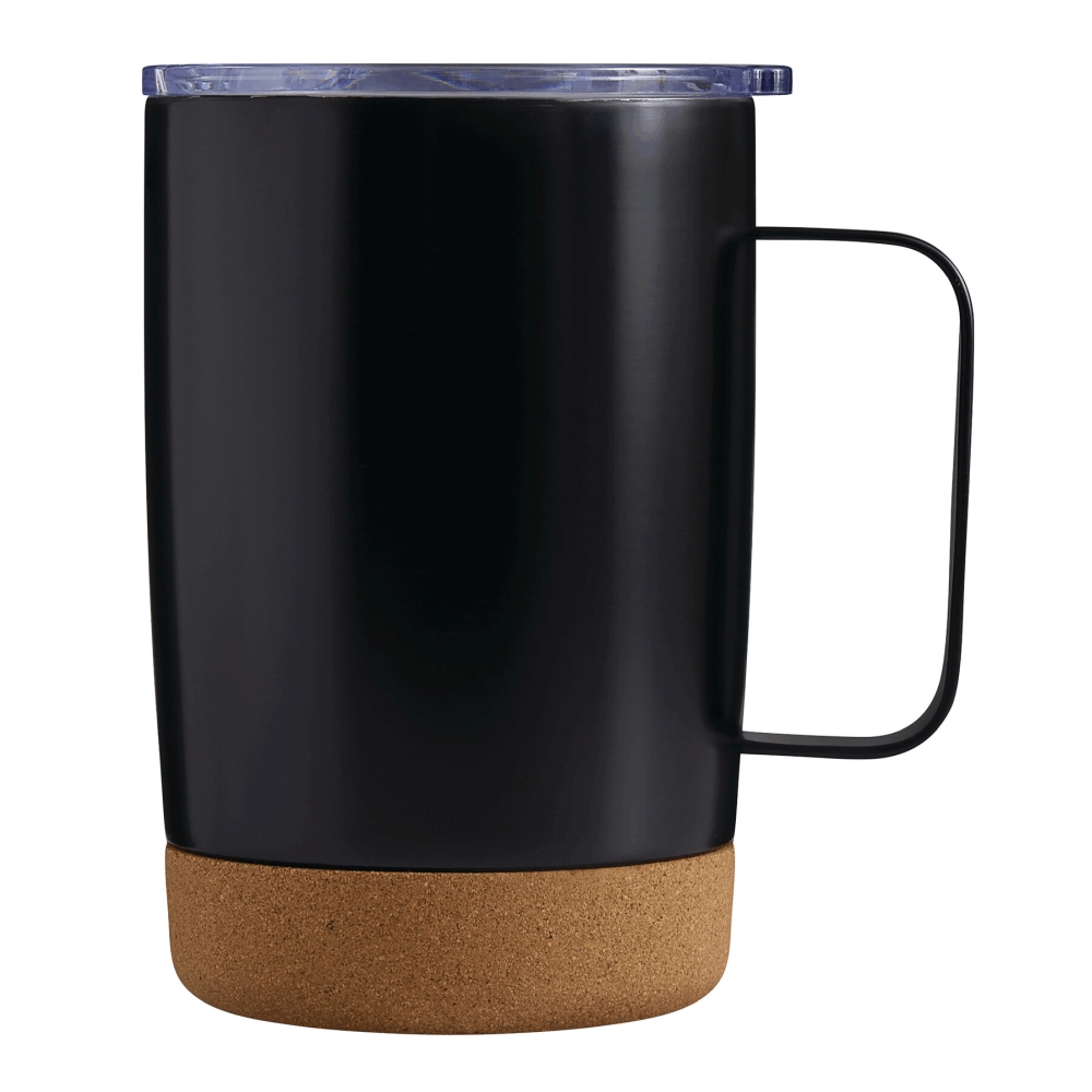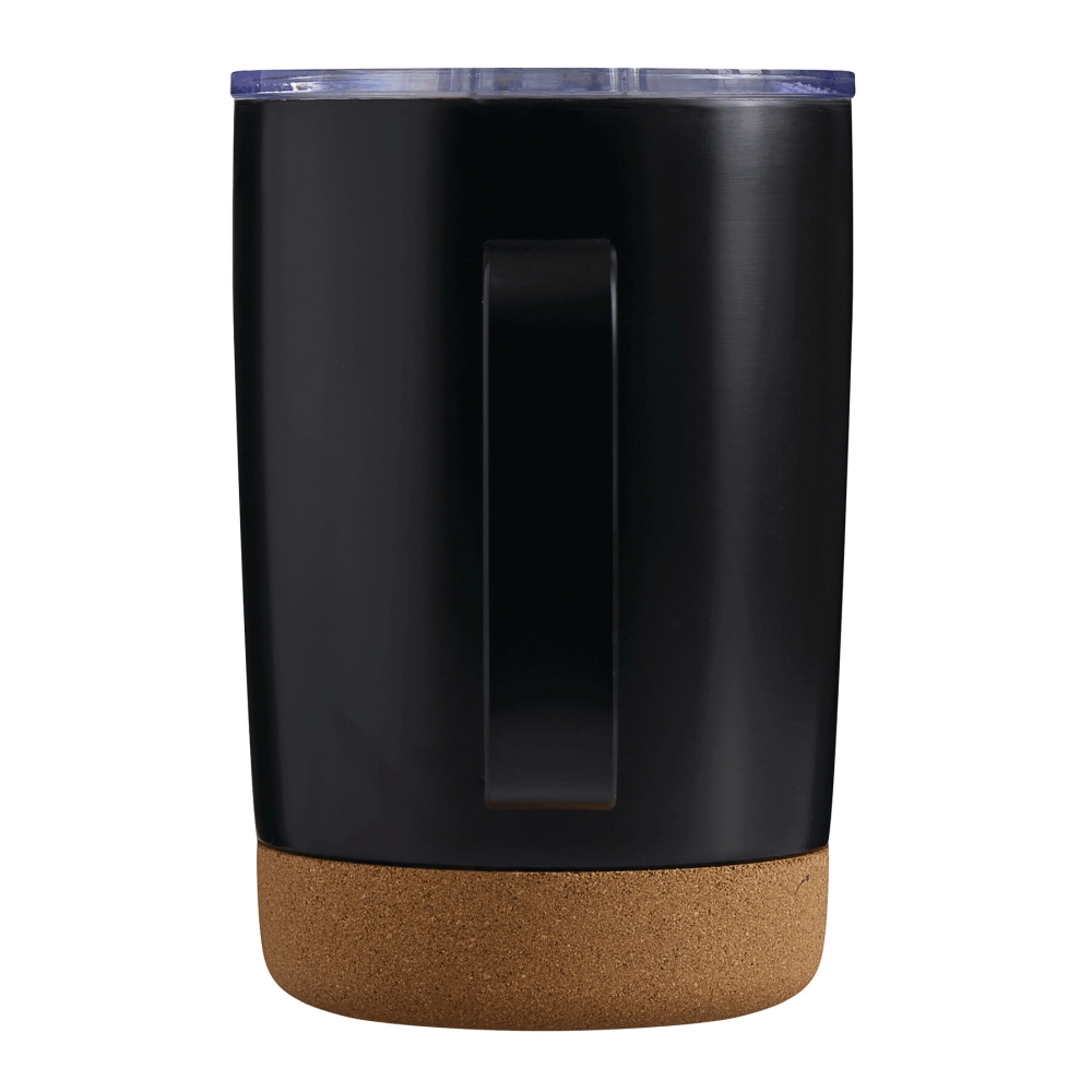 Dvoustěnný vakuový hrnek na pití, uvnitř i vně z nerezové oceli, s korkovým dnem a praktickým uchem, plastové víko se silikonovým těsněním a integrovaným posuvným otvorem na pití, objem cca 350 ml, udrží teplé nápoje cca 4 hodiny a studené až 8 hodin, baleno v krabičce. Rozměry: O8,5 x 13 cm
