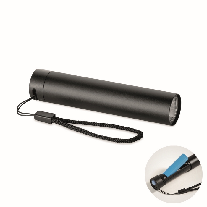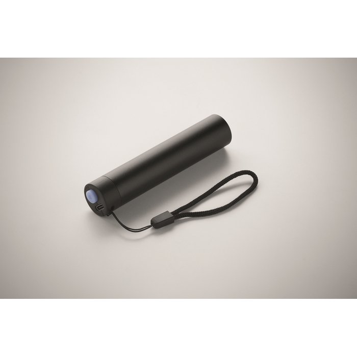 Dobíjecí svítilna z recyklovaného hliníku, 110 lumenů, se 3 nastaveními svícení. 1 vyměnitelná a dobíjecí 14500 lithiová baterie 400 mAh. Rozměry: 2.1 x 2.1 x 10 cm