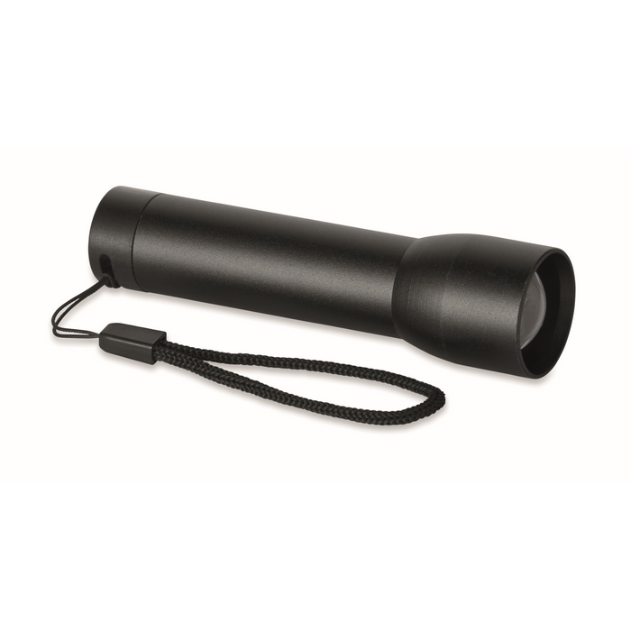 Dobíjecí svítilna z recyklovaného hliníku s několika nastaveními světla a zoom funkcí. Vyměnitelná lithiová baterie 14500. Výkonná a odolná pro každodenní použití. Rozměry: 2.5 x 2.5 x 10 cm