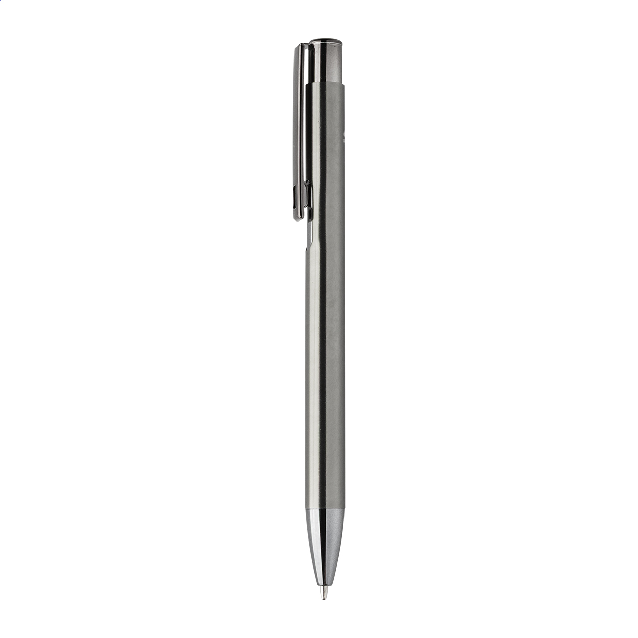Propiska z recyklovaného hliníku s lesklým kovovým povrchem. S modrou náplní.