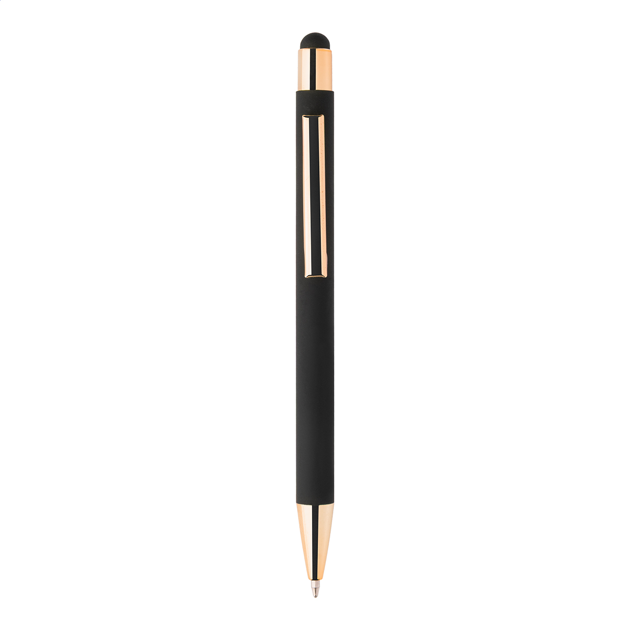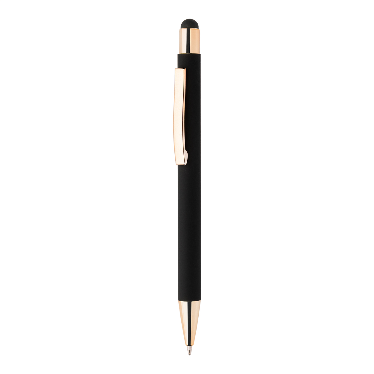 Propiska z recyklovaného hliníku na dotykovou obrazovku, s černým pogumovaným tělem a barevnými lesklými kovovými částmi. Se speciálním povrchem pro zrcadlové gravírování, které ladí s kovovými částmi. S modrou náplní.