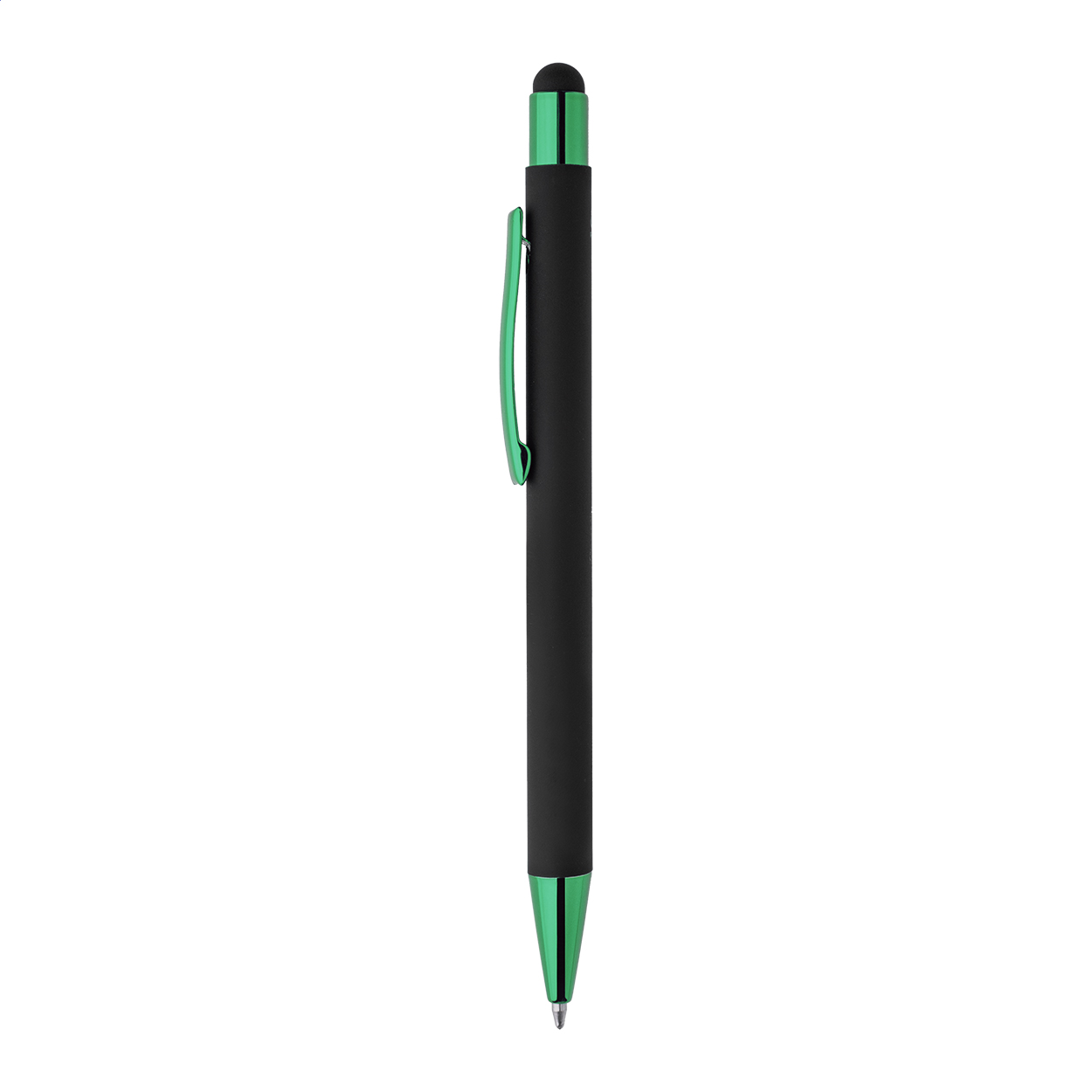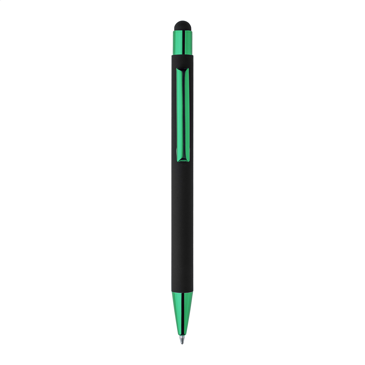 Propiska z recyklovaného hliníku na dotykovou obrazovku, s černým pogumovaným tělem a barevnými lesklými kovovými částmi. Se speciálním povrchem pro zrcadlové gravírování, které ladí s kovovými částmi. S modrou náplní.