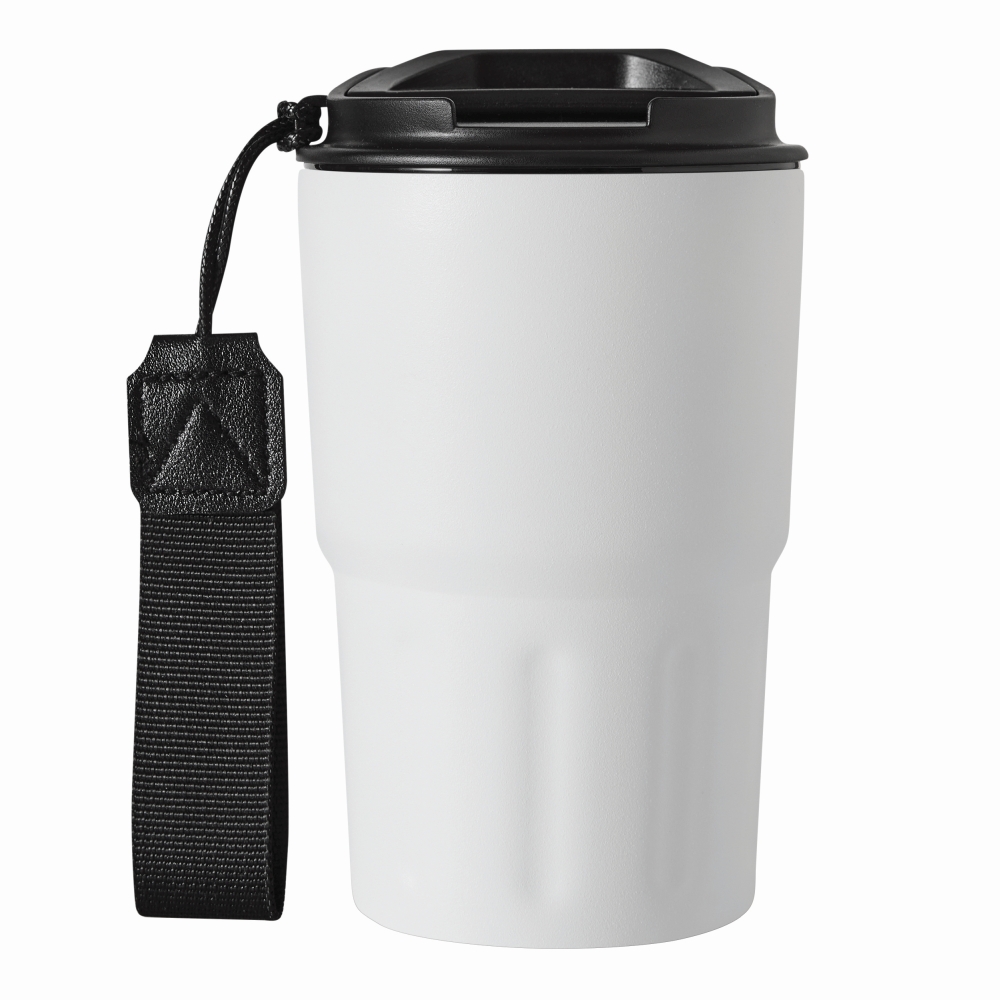 Izolovaný hrnek, dvoustěnný: uvnitř i vně z nerezové oceli, matný práškový lak, plastové víčko s bezpečným šroubovacím uzávěrem, silikonové těsnění a integrovaný otvor na pití, kapacita cca. 400 ml, poutko na zápěstí z recyklovaného plastu. Rozměry: O8,8 x 14,7 cm