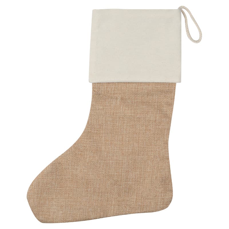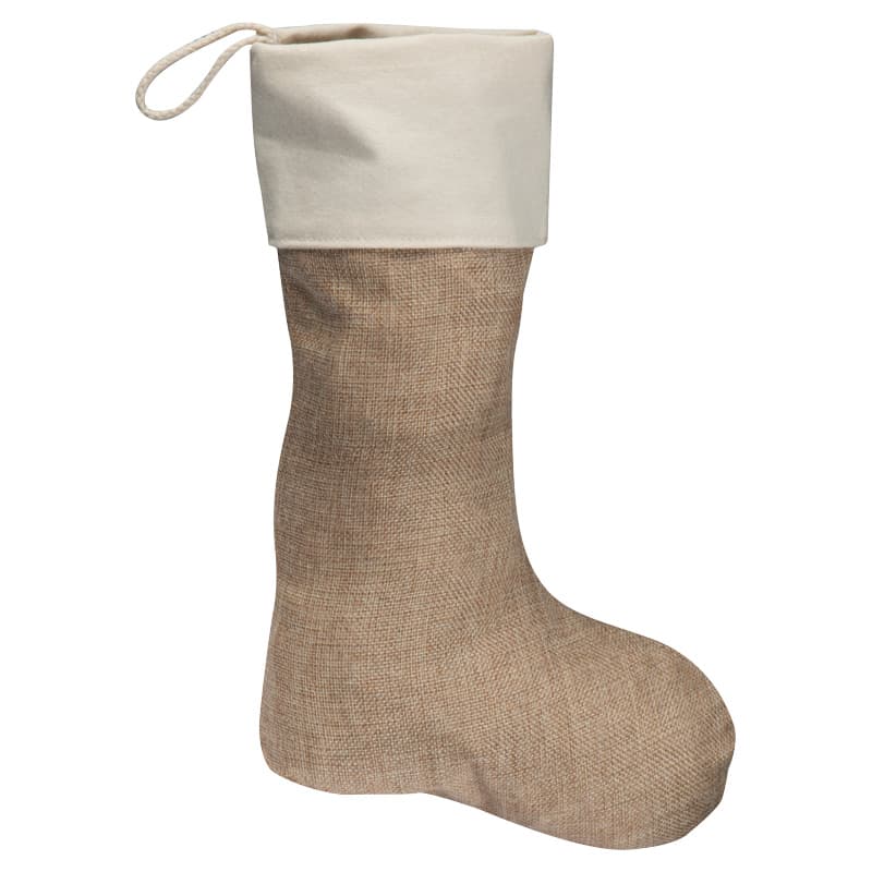 Vánoční ponožka z juty s bílým lemem, ideální na dárečky, pověšení nebo prostě jako vánoční dekorace ke krbu. Rozměry: 10 x 10 cm.