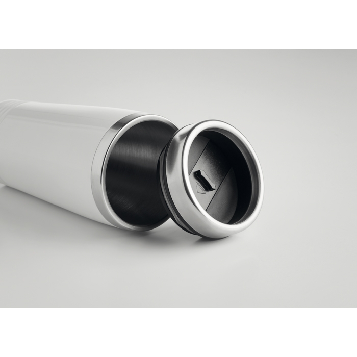 Dvoustěnný cestovní hrnek z nerezové oceli s černým plastovým víčkem. Objem 400 ml. Rozměry: O 8 × 17,5 cm.