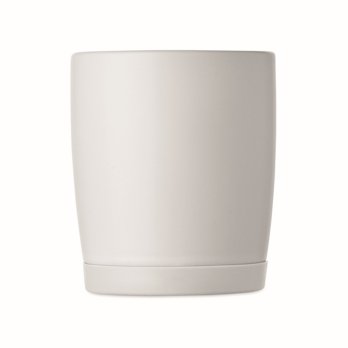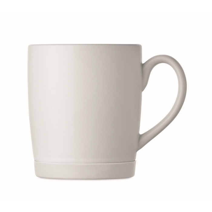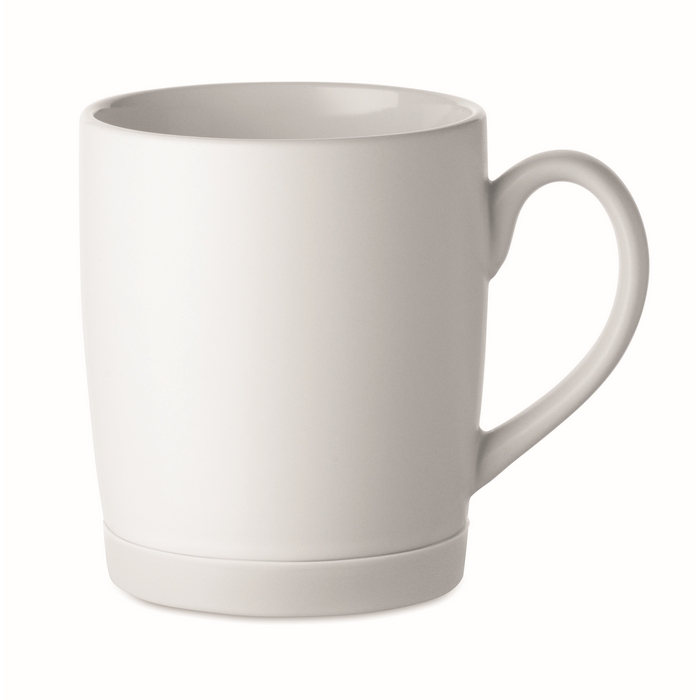 Keramický hrnek s bílým matným povrchem a silikonovým podstavcem pro lepší stabilitu. Objem 300 ml. Jednotlivě baleno v bílé kartonové krabičce. Rozměry: O8.2 x 9.4 cm