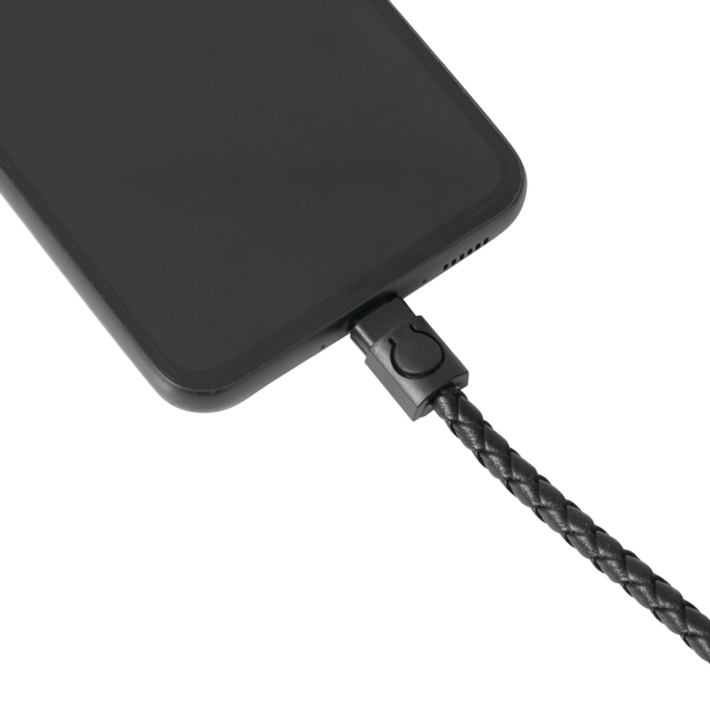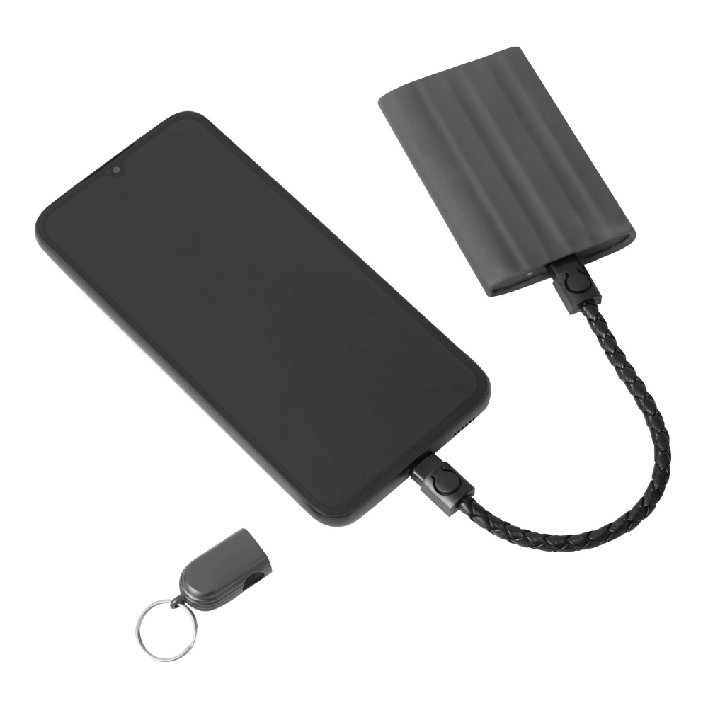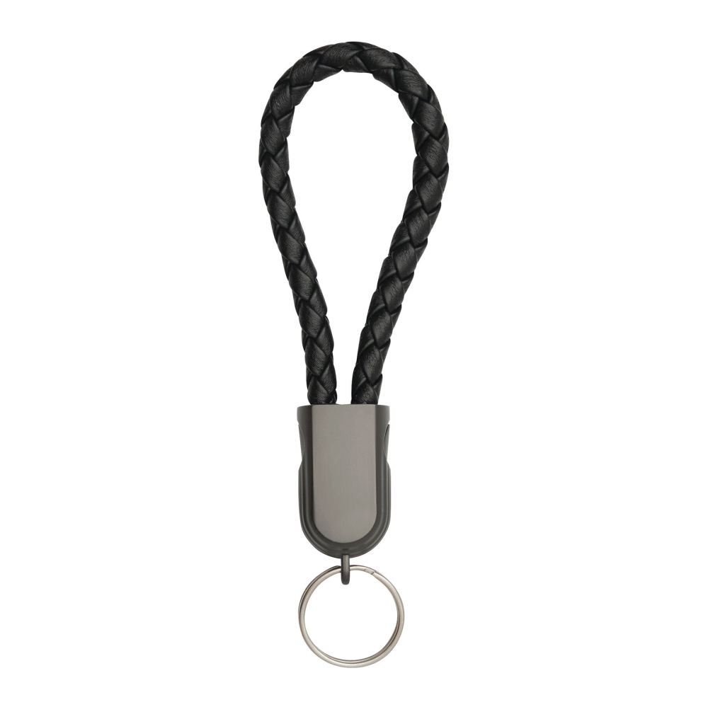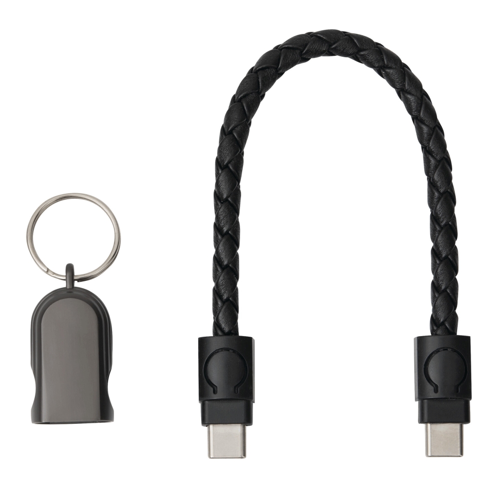 Klíčenka s kabelem pro nabíjení chytrých telefonů, zařízení napájených přes USB a notebooků (napájení 60 W) a také pro přenos dat, s tkaným PU povlakem, včetně 2 nabíjecích konektorů (USB typu C), USB konektory jsou bezpečně uloženy v krytce ze zinkové slitiny, s kroužkem na klíče. Rozměry: 12 x 2 cm