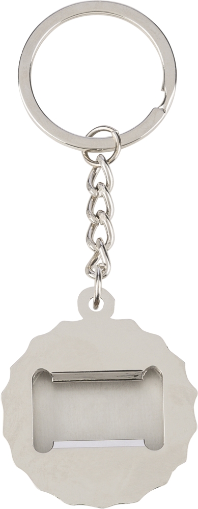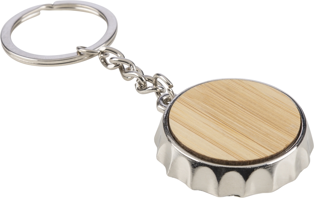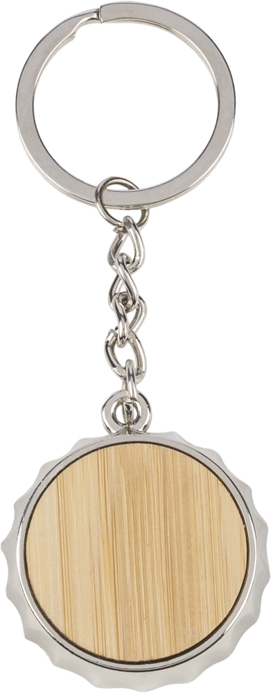 Klíčenka ze zinkové slitiny s bambusovou intarzií na přední straně a integrovaným otvírákem na lahve na zadní straně. S kovovým kroužkem na klíče a balena v papírovém sáčku. Rozměry: 3,8 cm x 7,1 cm