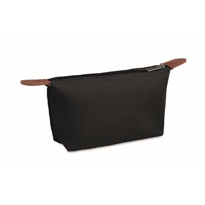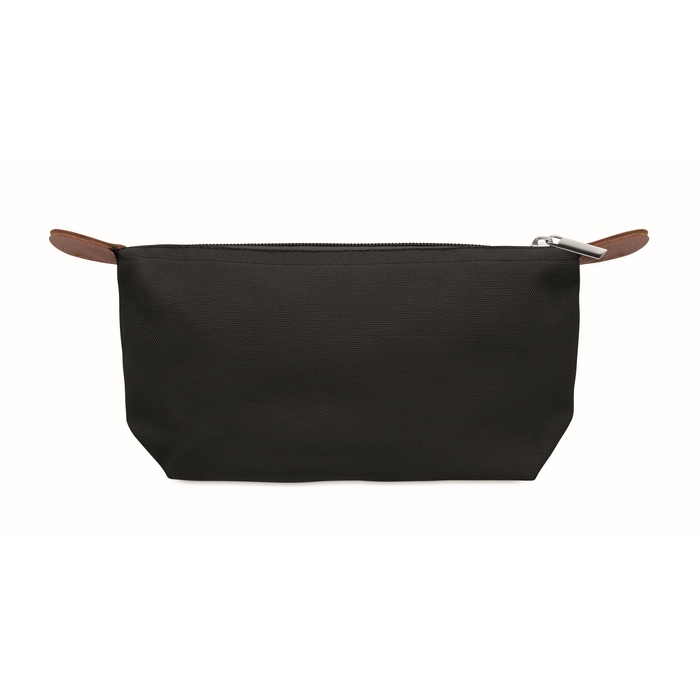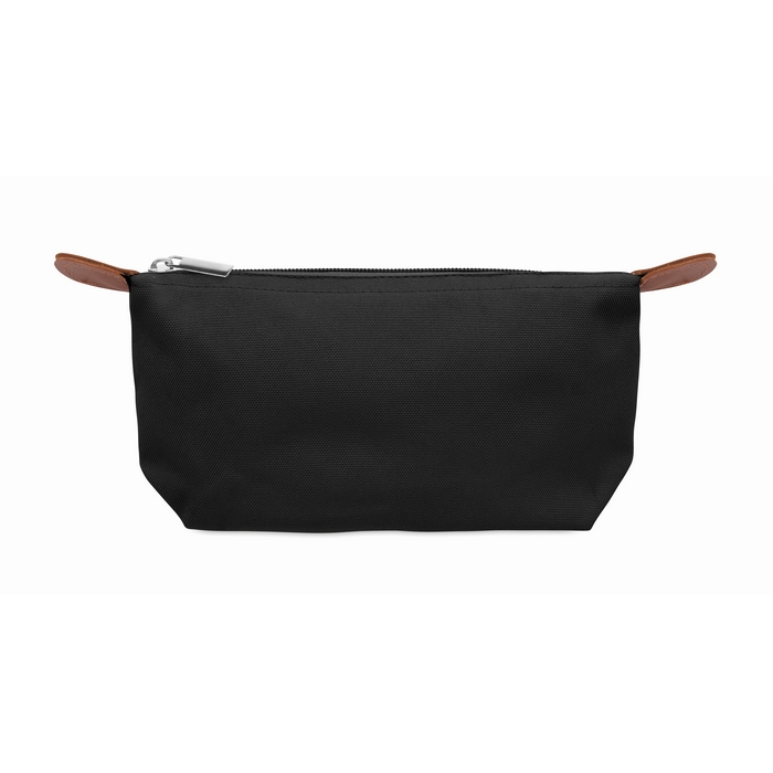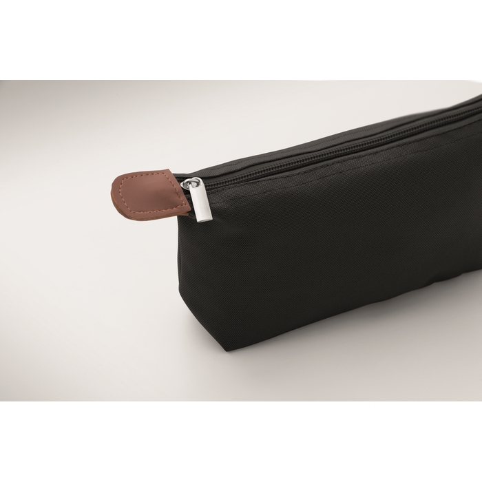 Kosmetická taštička z polyesteru 600D RPET s horním zapínáním na zip a hnědým PU detailem. Rozměry: 20 x 5.5 x 12 cm