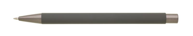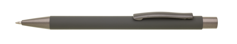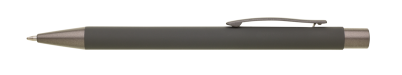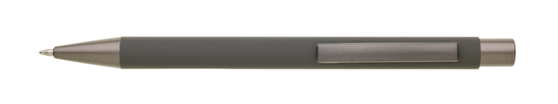 Kovová propiska s hnědo-černými doplňky, s pogumovaným povrchem. Velkoobjemová modrá náplň.