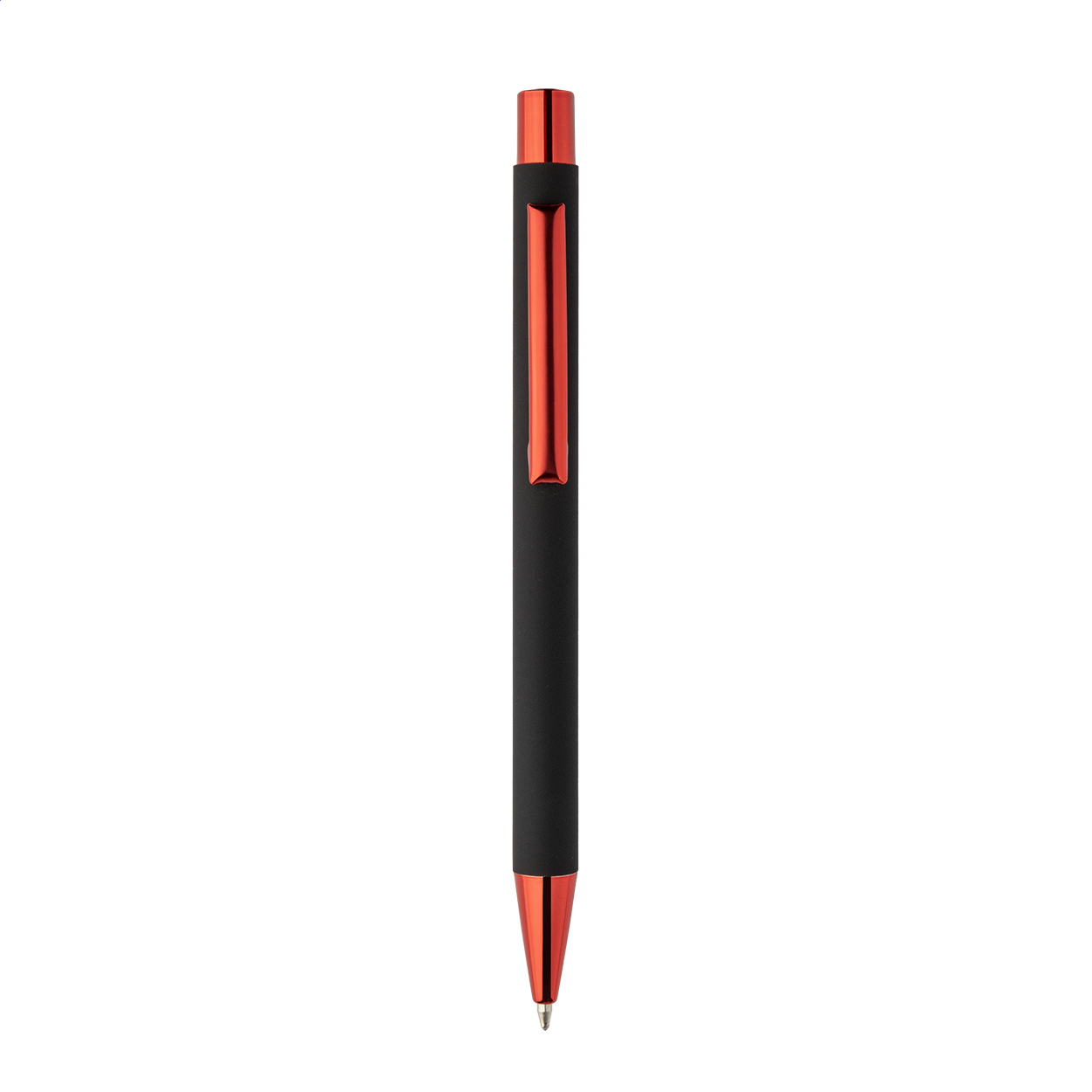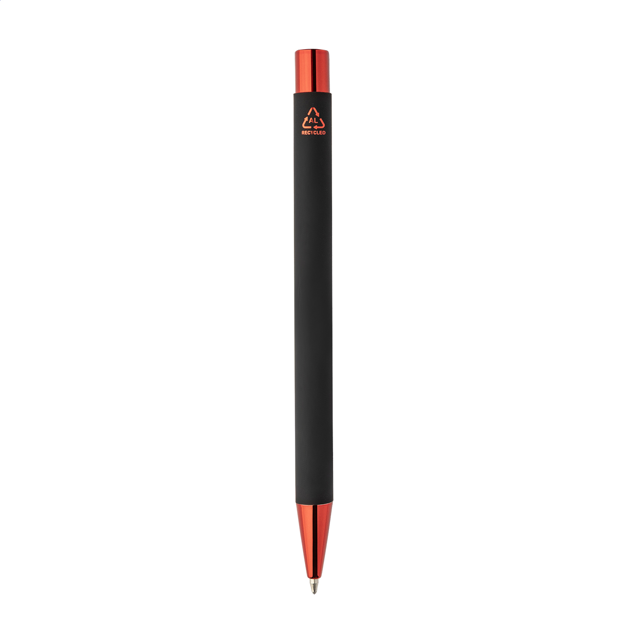 Kuličkové pero z recyklovaného hliníku s černým pogumovaným tělem a barevnými lesklými kovovými částmi. Se speciálním povrchem pro zrcadlové gravírování, které ladí s kovovými částmi. S modrou náplní.