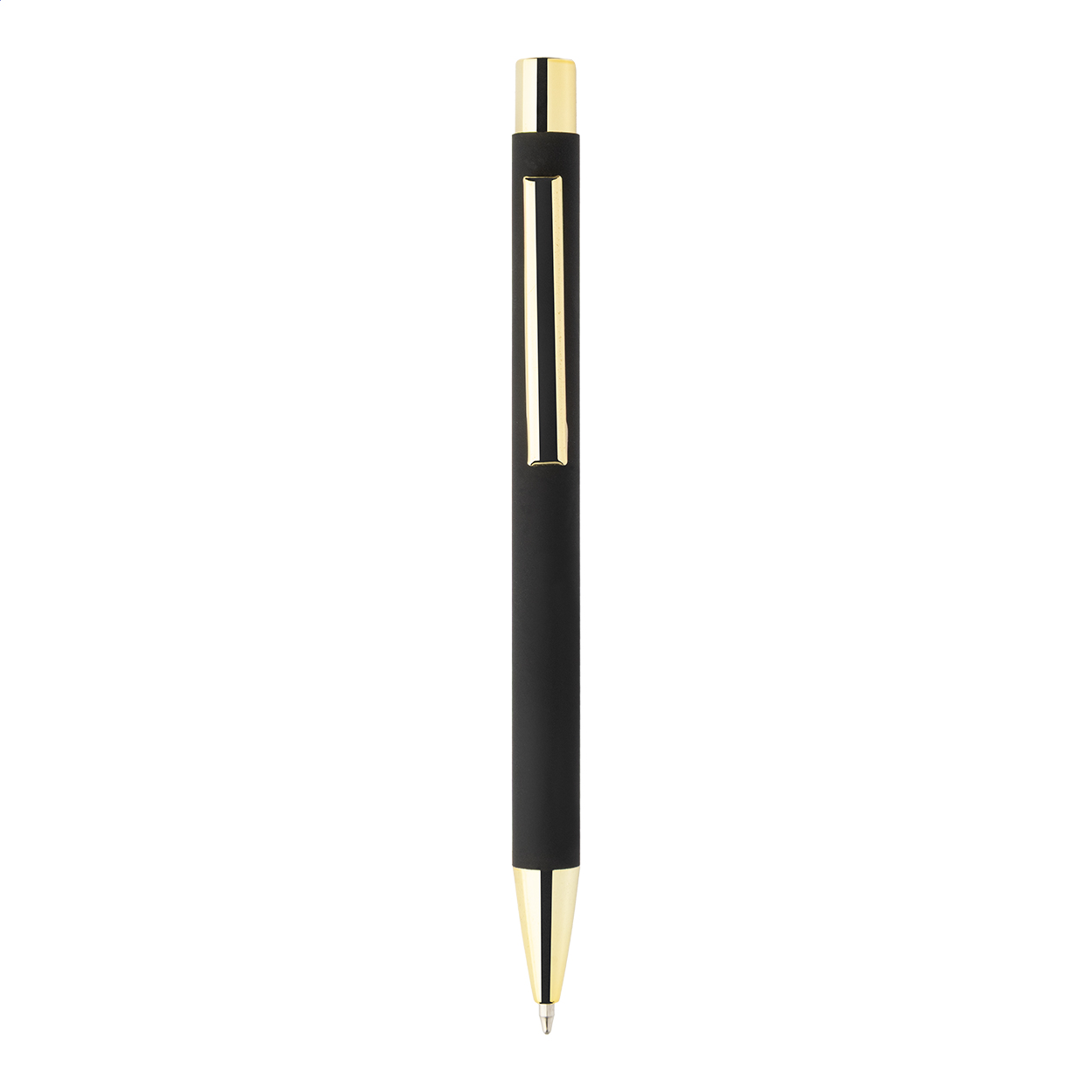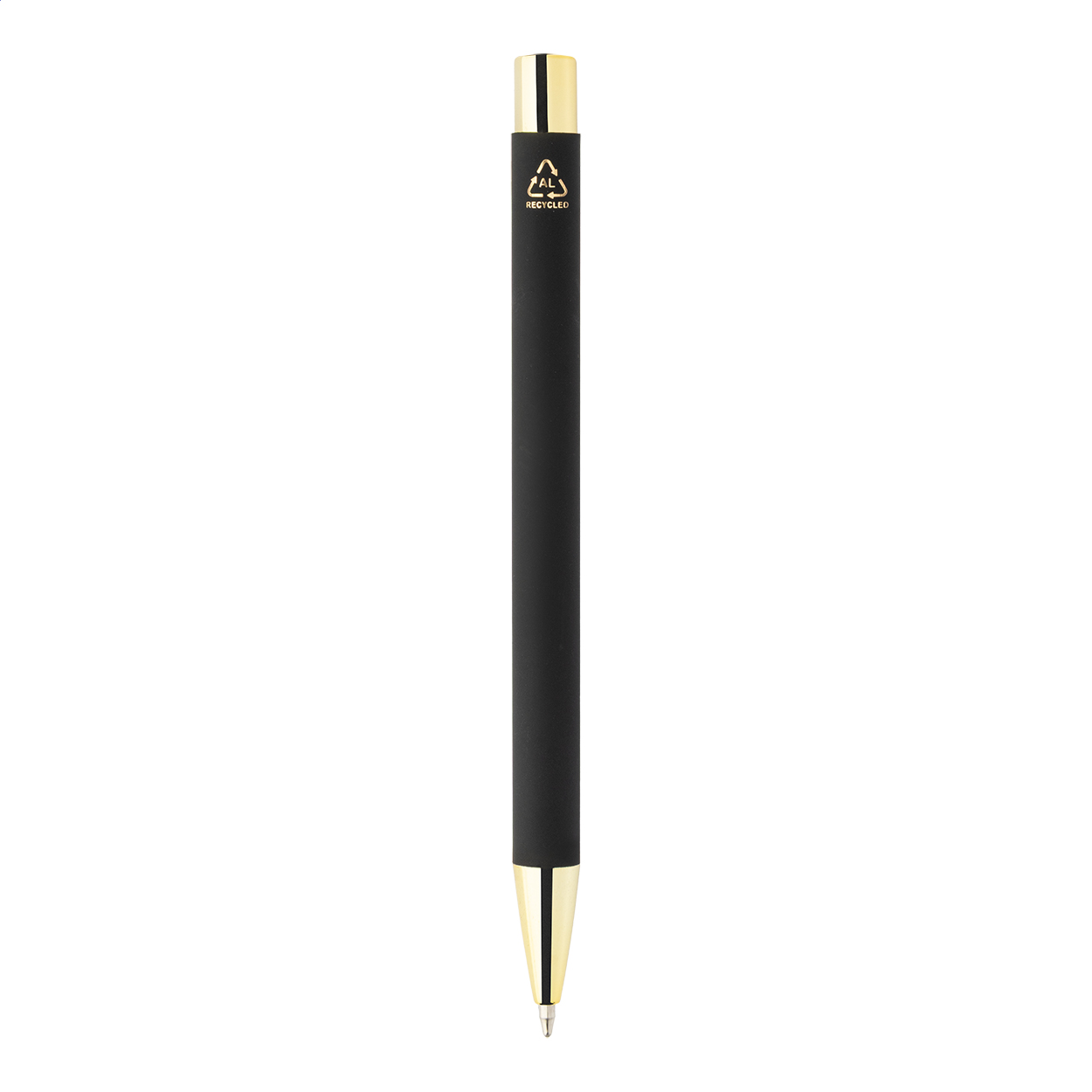 Kuličkové pero z recyklovaného hliníku s černým pogumovaným tělem a barevnými lesklými kovovými částmi. Se speciálním povrchem pro zrcadlové gravírování, které ladí s kovovými částmi. S modrou náplní.
