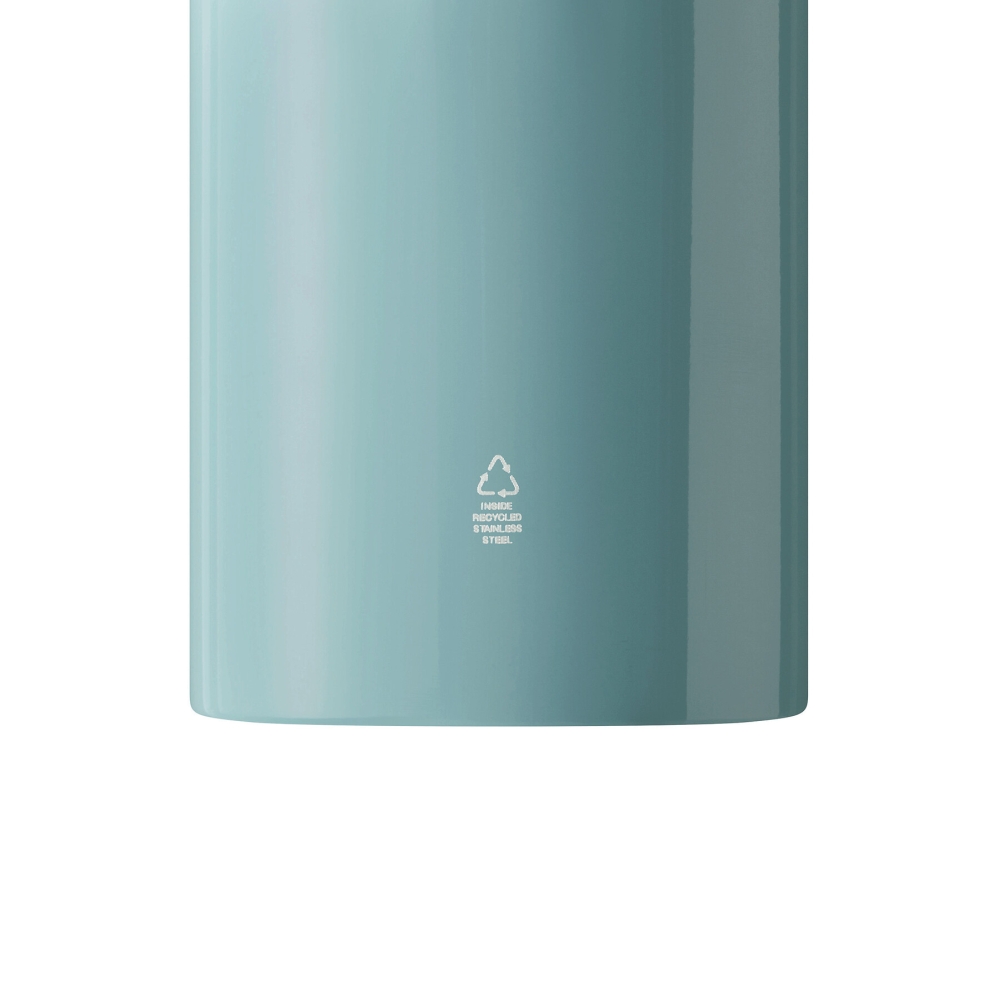 Láhev na pití, jednostěnná: vyrobena z recyklované nerezové oceli, bezpečnostní černý šroubovací uzávěr z plastu, silikonové těsnění, rukojeť na přenášení, kroužek na klíče a karabina (karabina NENÍ vhodná pro lezení), objem cca 400 ml. Rozměry: O7,2 x 19 cm