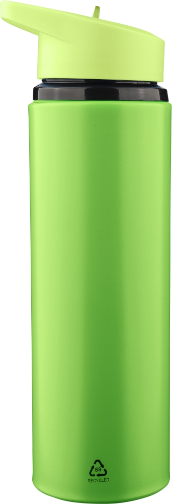 Láhev na pití z recyklované nerezové oceli (500 ml), jednostěnná, šroubovací víčko z PP s poutkem na nošení, skládací hubičkou a vnitřním brčkem. Vhodná pouze pro studené nápoje. Vyryté recyklované logo. Baleno v hnědé kartonové krabici. Rozměry: 7 cm x 24,4 cm