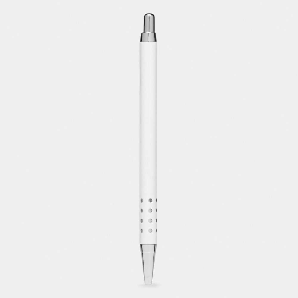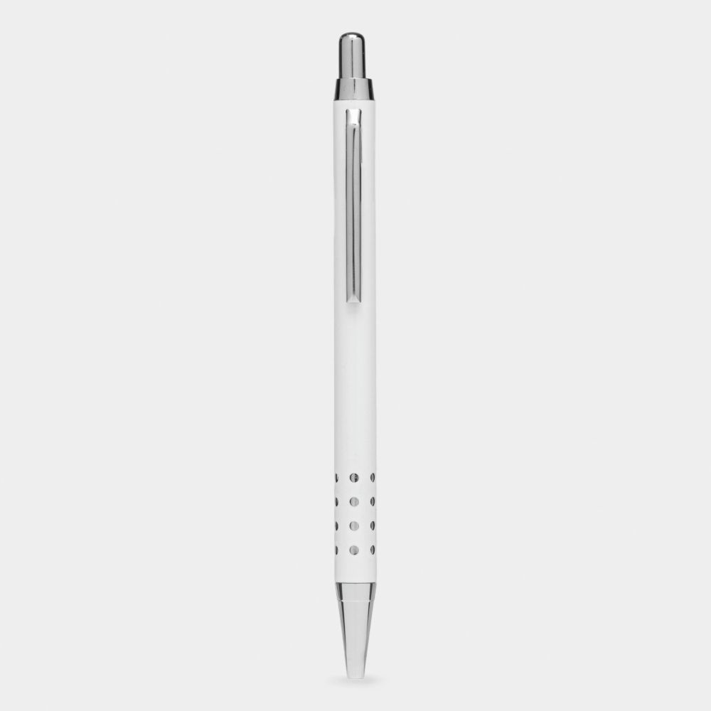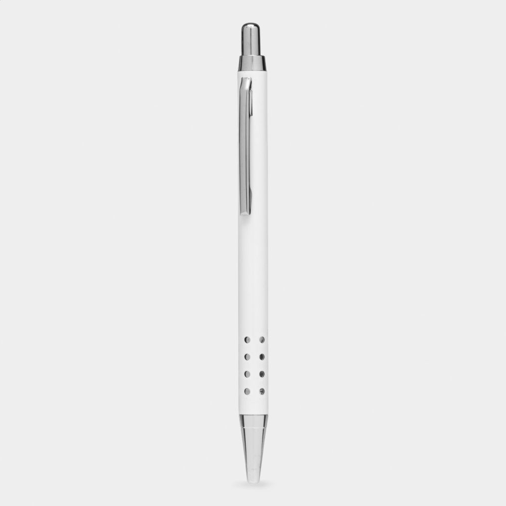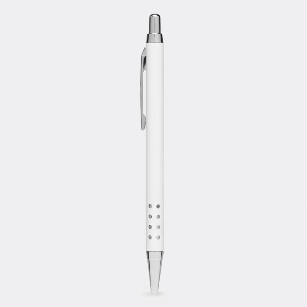 Mosazné pero s modrou náplní a tlačítkovým mechanismem. V úchopové části jsou dekorativní dírky. Rozměry: 13,5 cm