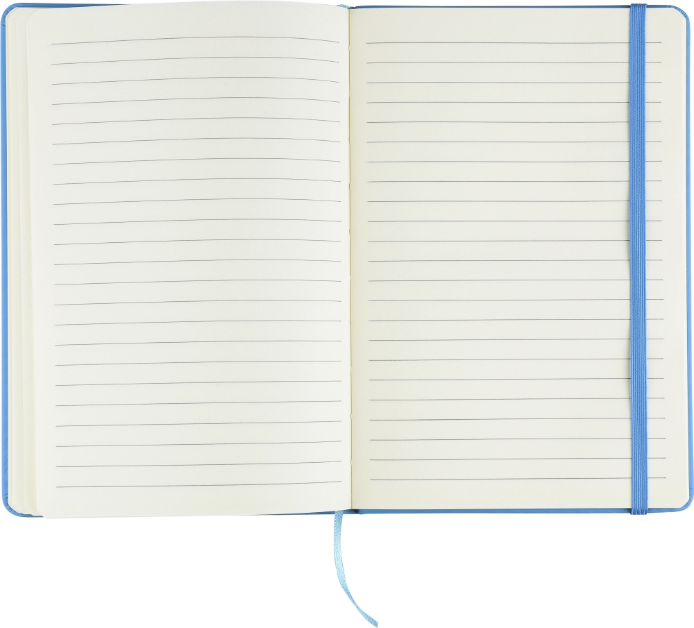 Poznámkový blok s tvrdými deskami z rPET PU, obsahující 80 linkovaných stran (70 g/m2). Obsahuje gumičku a stužku v odpovídající barvě. Obsahuje reliéfní recyklované logo na zadní straně. Rozměry: 21 x 14 x 1,2 cm
