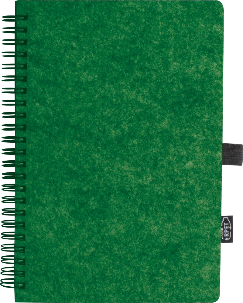Plstěný zápisník z RPET, obsahující 160 linkovaných stran z recyklovaného papíru se spirálovou vazbou, poutkem na propisku a označením RPET. Rozměry: 15,3 x 1,9 x 21,2 cm
