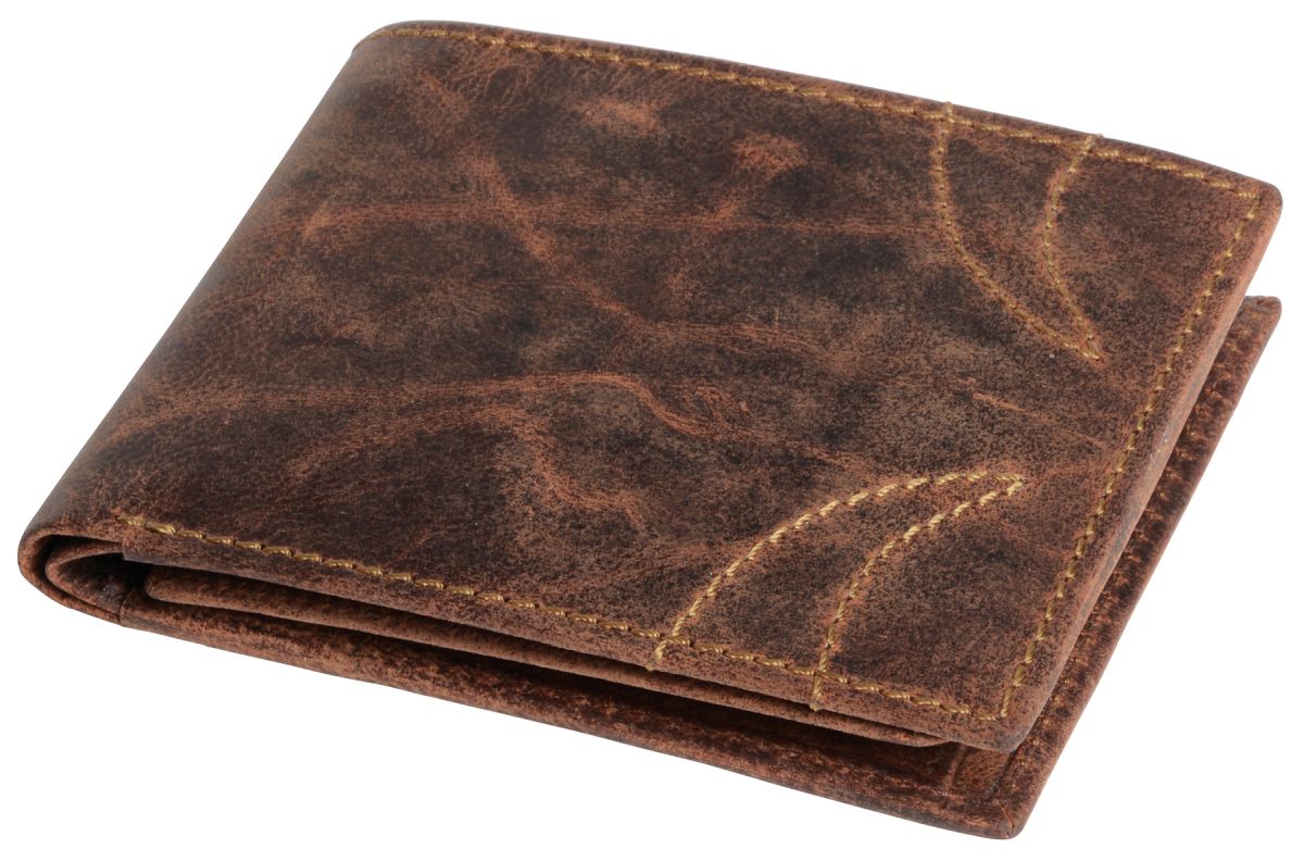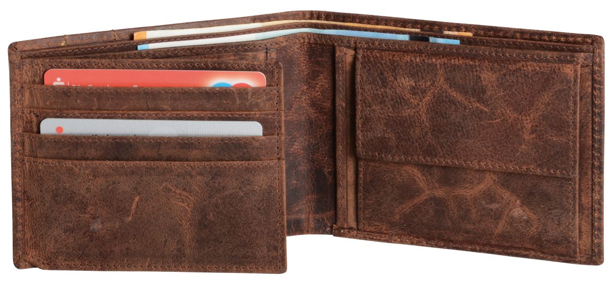 Pánská peněženka z pravé kůže obsahující 8 kapes na kreditní karty, 2 kapsy na bankovky, 1 kapsu na mince se zapínáním na druk, síťovanou kapsu na občanský a řidičský průkaz a dvě doplňkové kapsičky.Rozměry: 12 × 9,4 × 2,3 cm. Poznámka: Dodáváme bez dekorace.