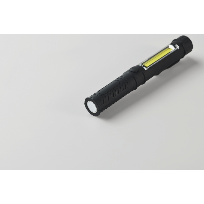 Magnetická pracovní LED svítilna z ABS s klipem a bočním COB světlem. Magnetická základna. Vyžaduje 3 baterie AAA (nejsou součástí dodávky). Rozměry: 16.6 x 2.3 x 2.3 cm