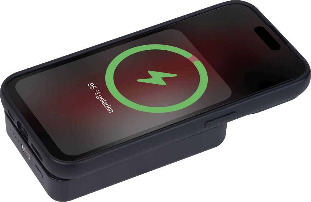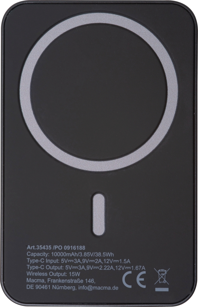 Powerbanka Magsafe® z recyklovaného ABS s kapacitou 10 000 mAh a funkcí super rychlého nabíjení 15W, obsahuje USB-C kabel. Vestavěný magnet umožňuje přímou montáž na iPhone®. Pro jiné zařízení Qi funguje jako bezdrátová nabíječka. Rozměry: 10,1 x 6,5 x 1,8 cm
