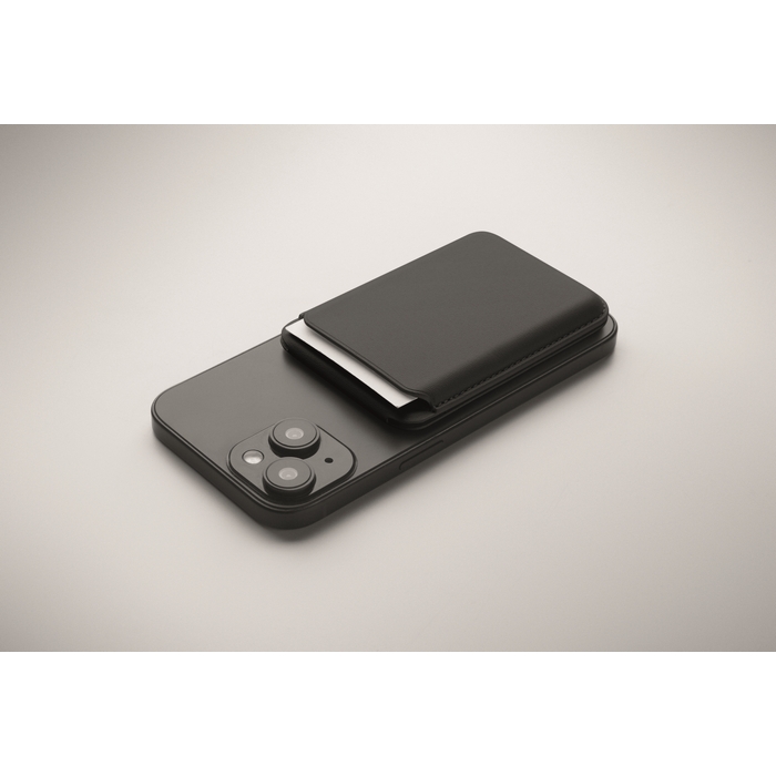 Magnetické pouzdro na kreditní karty z PU kůže (pro 3 karty) se stojánkem. Součástí je i další kovový kroužek. Rozměry: 6.5 x 9.5 x 1 cm