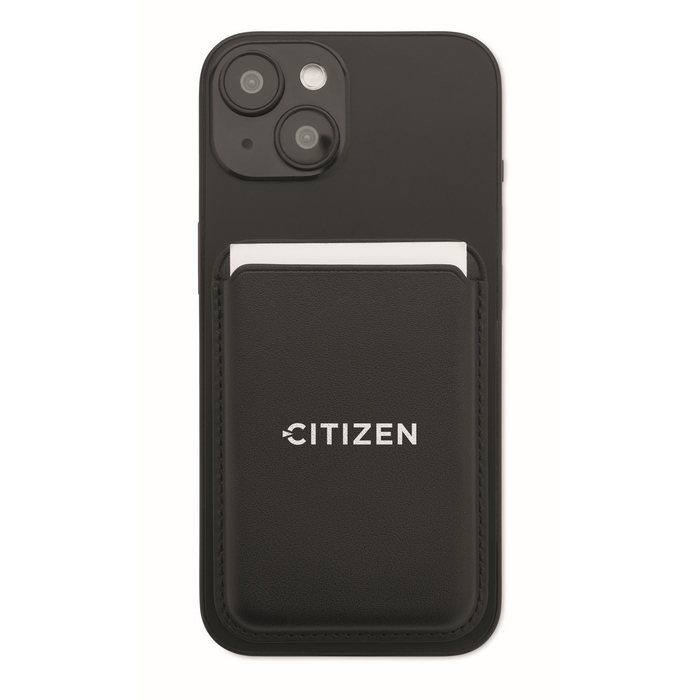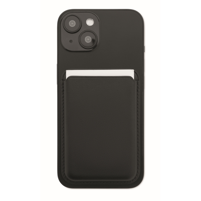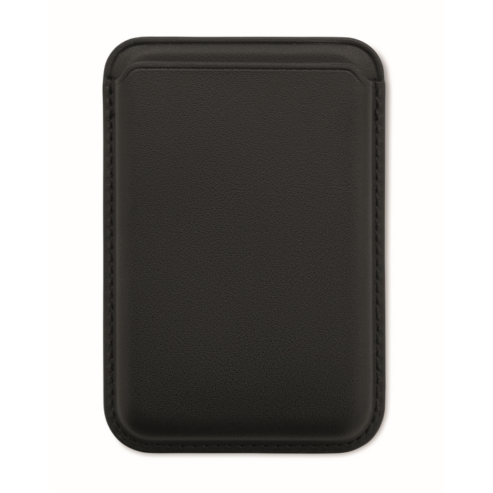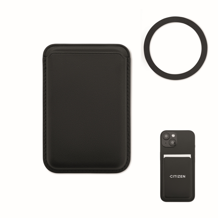 Magnetické pouzdro na kreditní karty z PU kůže (na 3 karty) s funkcí stojánku. Obsahuje přídavný kovový kroužek. Rozměry: 6.5 x 9.5 x 0.8 cm