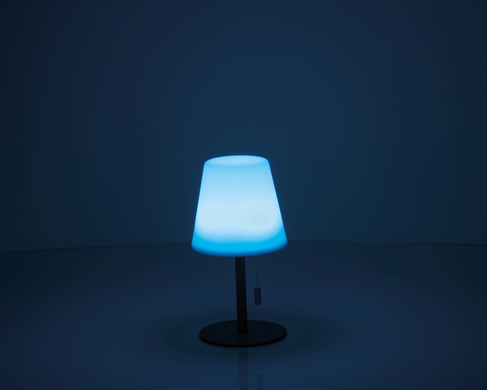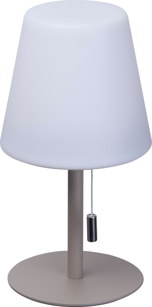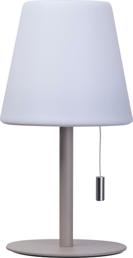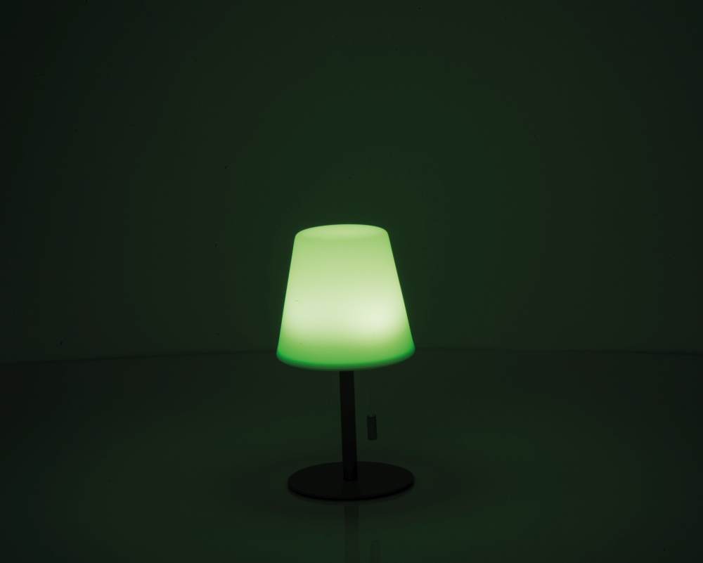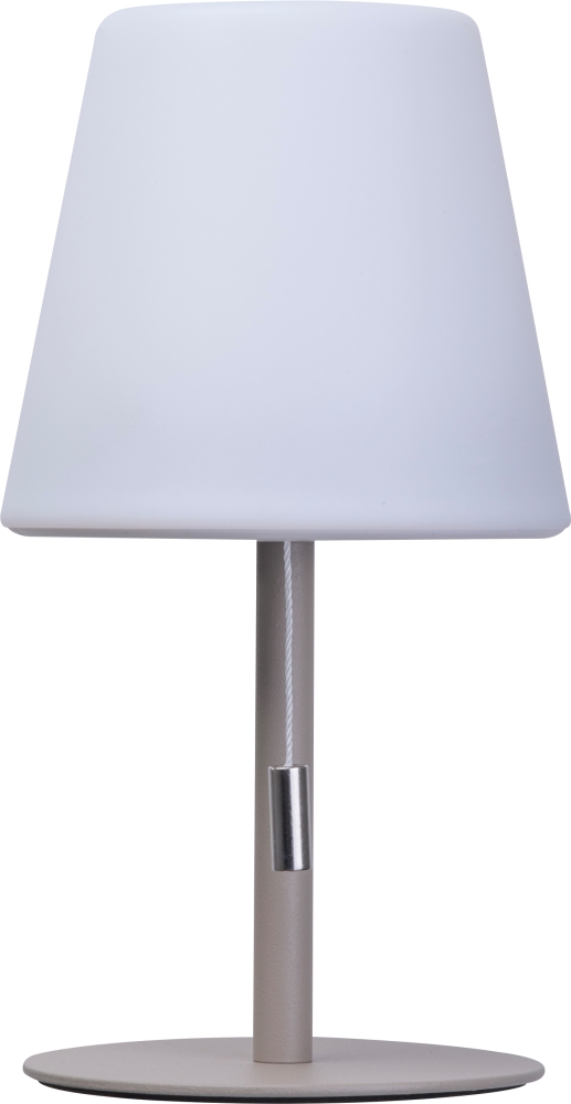 Malá venkovní lampa se změnou barvy, O 11 × 20 cm, výdrž 4–10 hodin, 3,7 V, dobíjecí baterie 1 200 mAh, stínítko z PP, kovová základna. Vhodné do zahrady, na terasu nebo balkon. Rozměry: o 11 x 20 cm