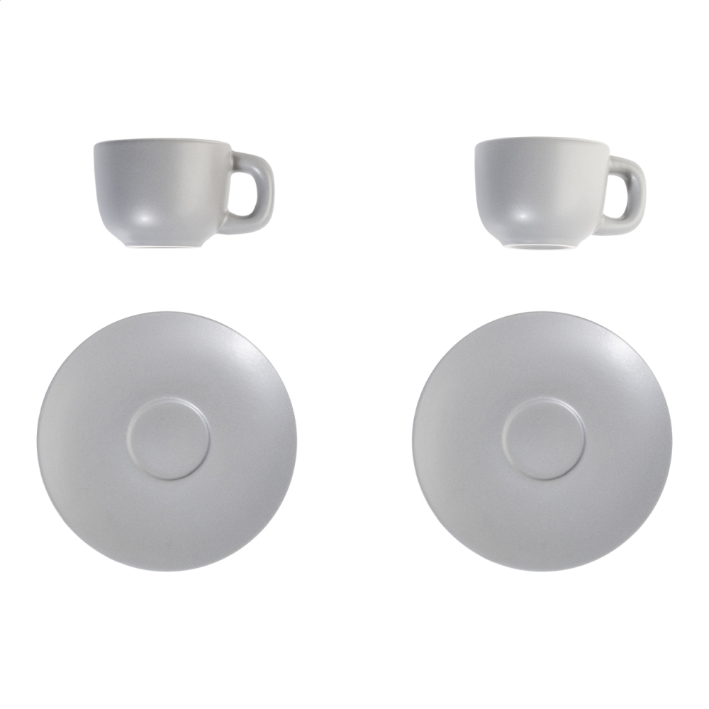 Sada dvou keramických šálků a podšálků na espresso. S matnou vnější a lesklou vnitřní povrchovou úpravou. Objem 85 ml. Dodáváno v krabičce. Rozměry: 13 × 13 × 8,7 cm.