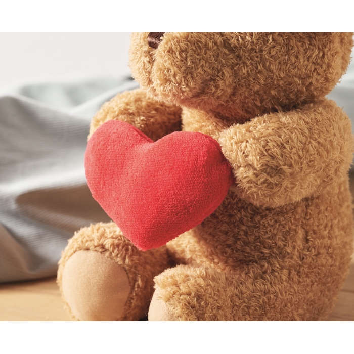 Plyšový medvídek z polyesteru s červeným srdíčkem. Vyšívané oči, nos a pusa. Rozměry: 23 cm