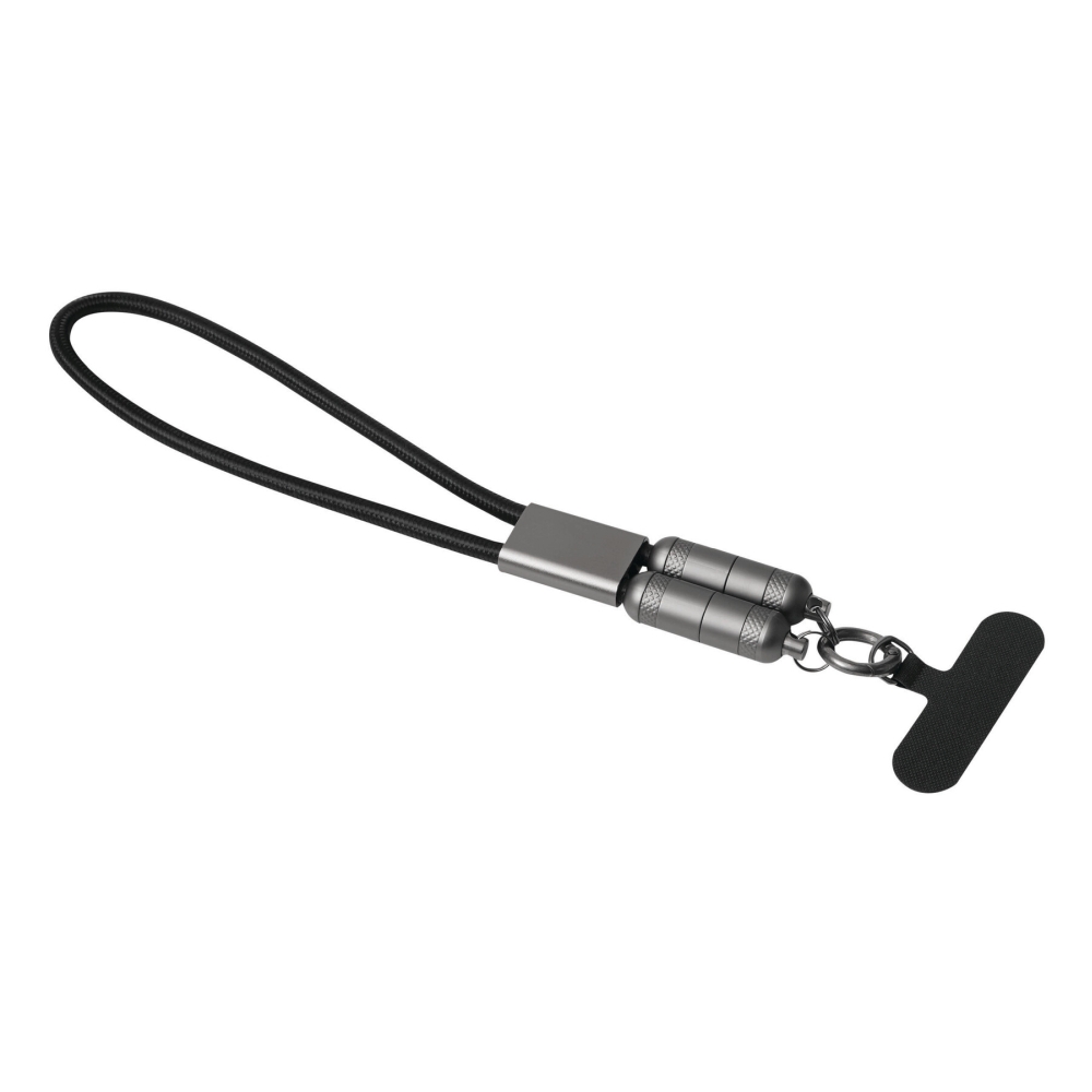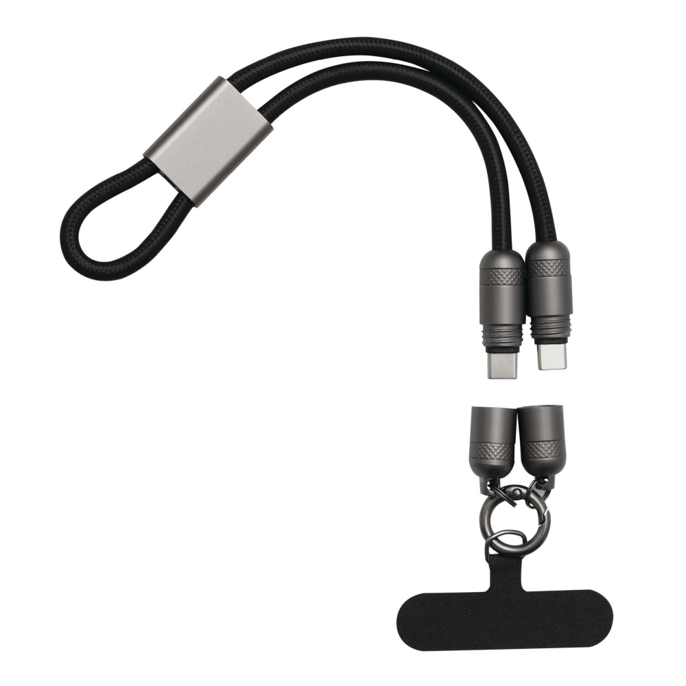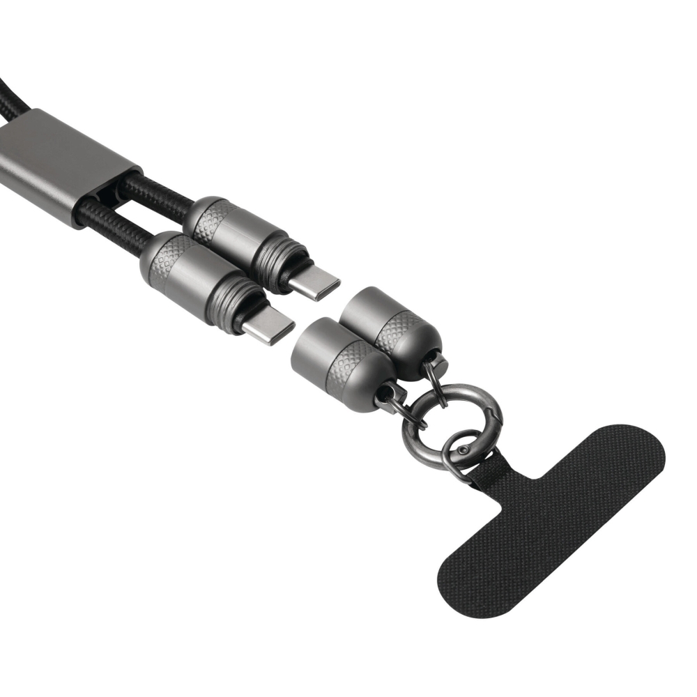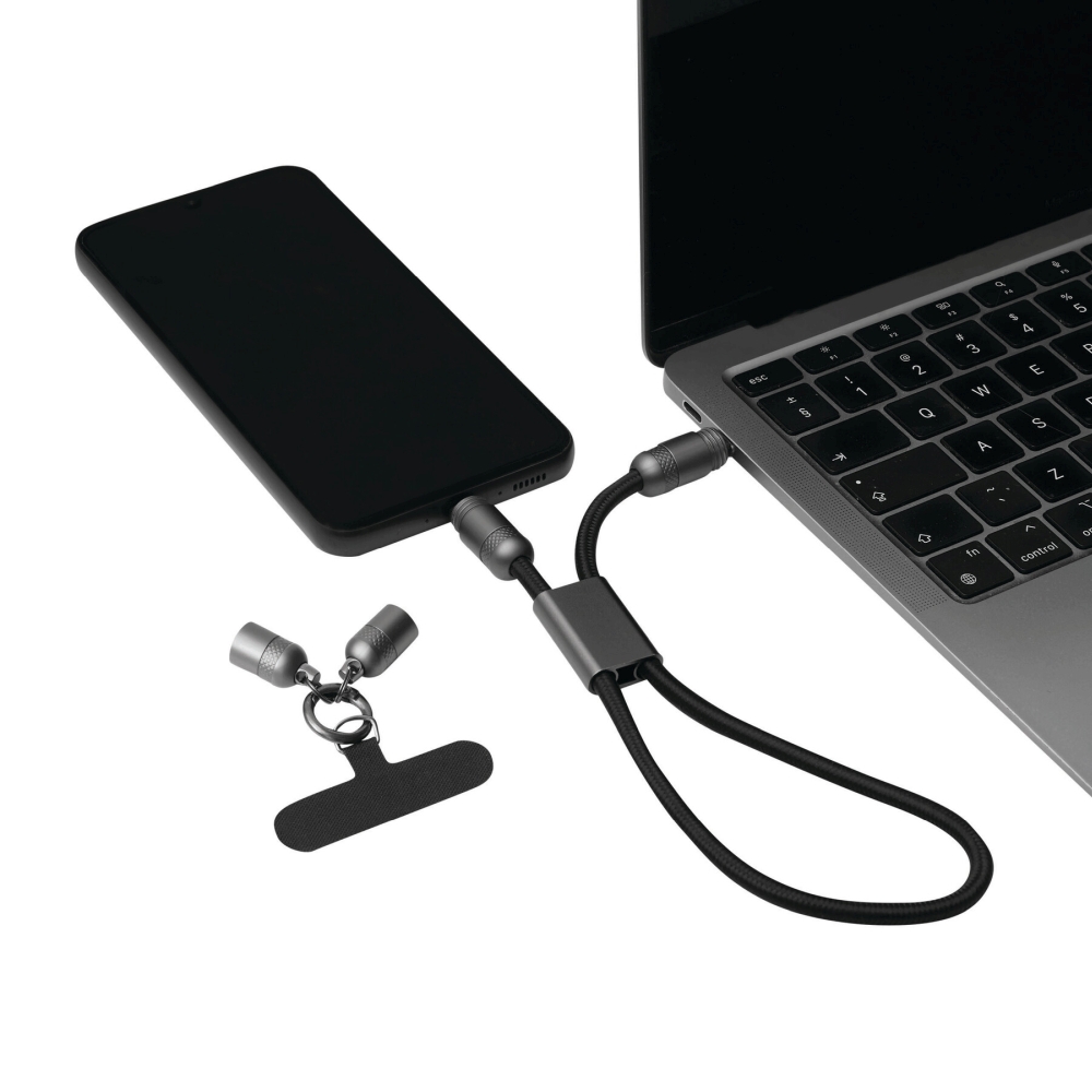 Multifunkční nabíjecí a datový kabel pro nabíjení chytrých telefonů a zařízení napájených přes USB, včetně notebooků (výkon 65 W), a také pro přenos dat, obsahuje 2 nabíjecí konektory (USB typu C), délka kabelu cca 108 cm, nabíjecí a datový kabel slouží také jako šňůrka na telefon s upevňovací destičkou, kterou lze umístit mezi chytrý telefon a pouzdro (vhodné pouze pro pouzdra s plnou ochranou okrajů), obsahuje karabinu (karabina NENÍ vhodná pro lezení). Rozměry: 108 x 2,5 x 1,3 cm