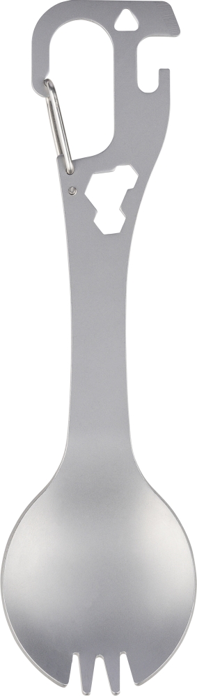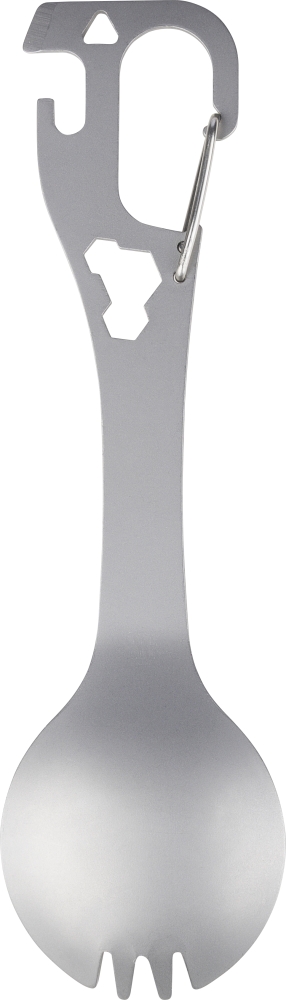 Multifunkční nerezový příbor s integrovanou vidličkou a lžící, plochým šroubovákem, otvírákem na lahve a konzervy a třemi imbusovými klíči v těle. Součástí je karabinka. Baleno po kusech v papírovém sáčku. Rozměry: 1,48 cm x 150 cm