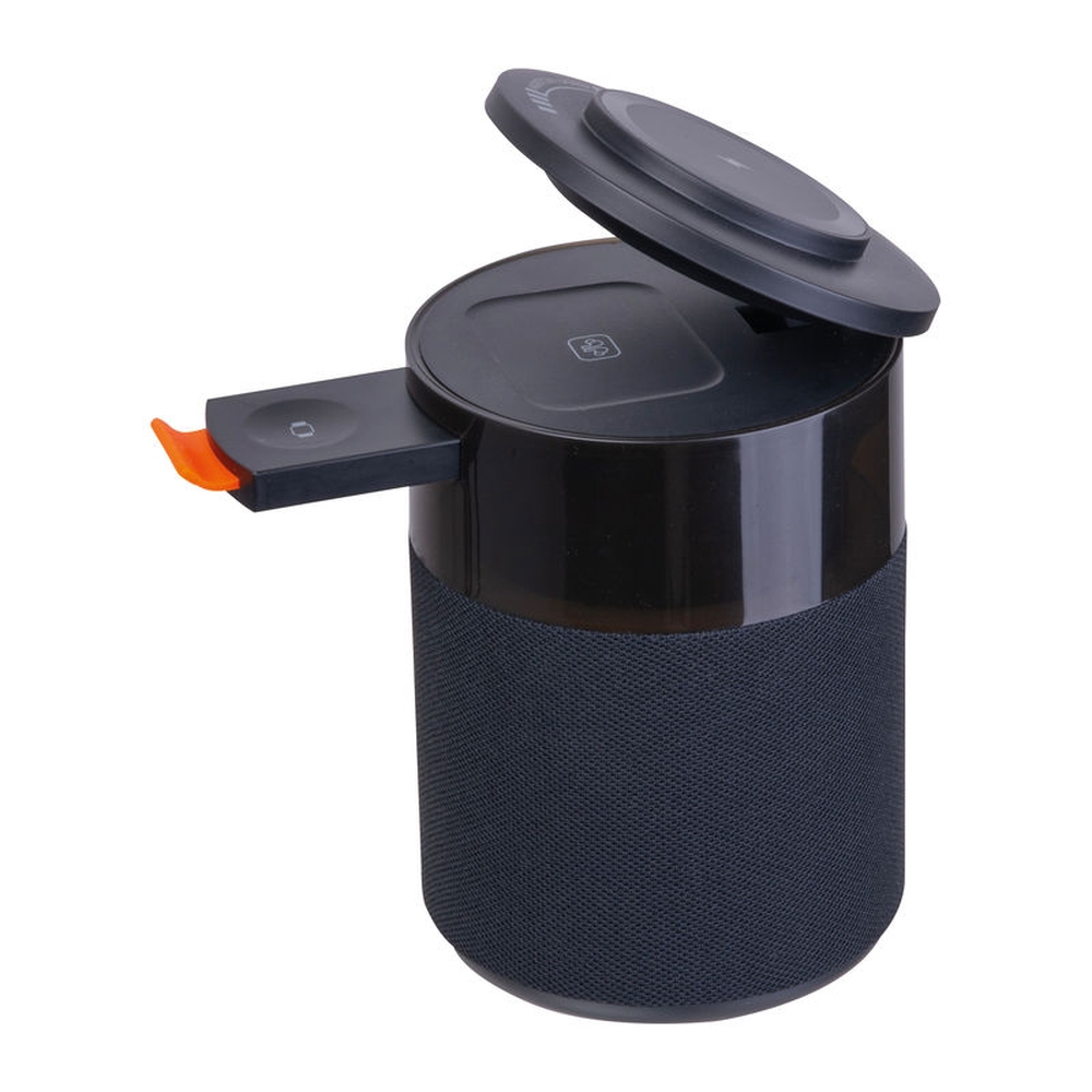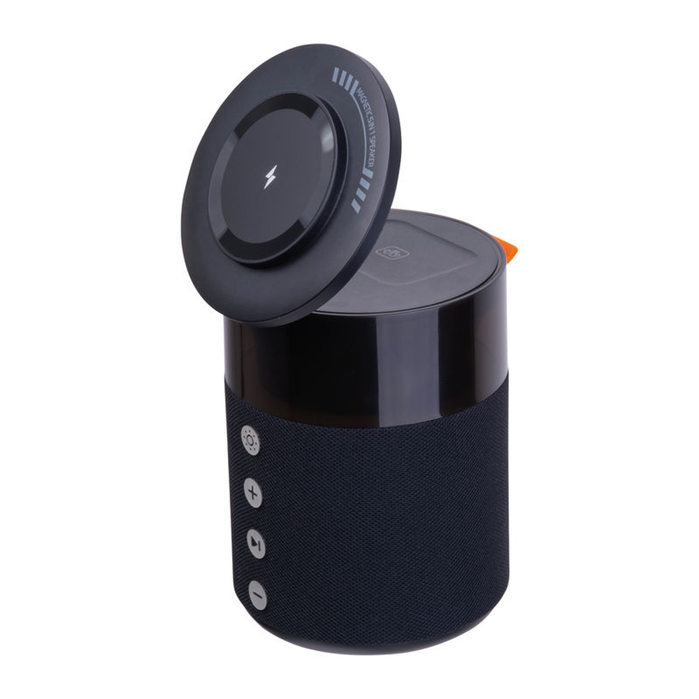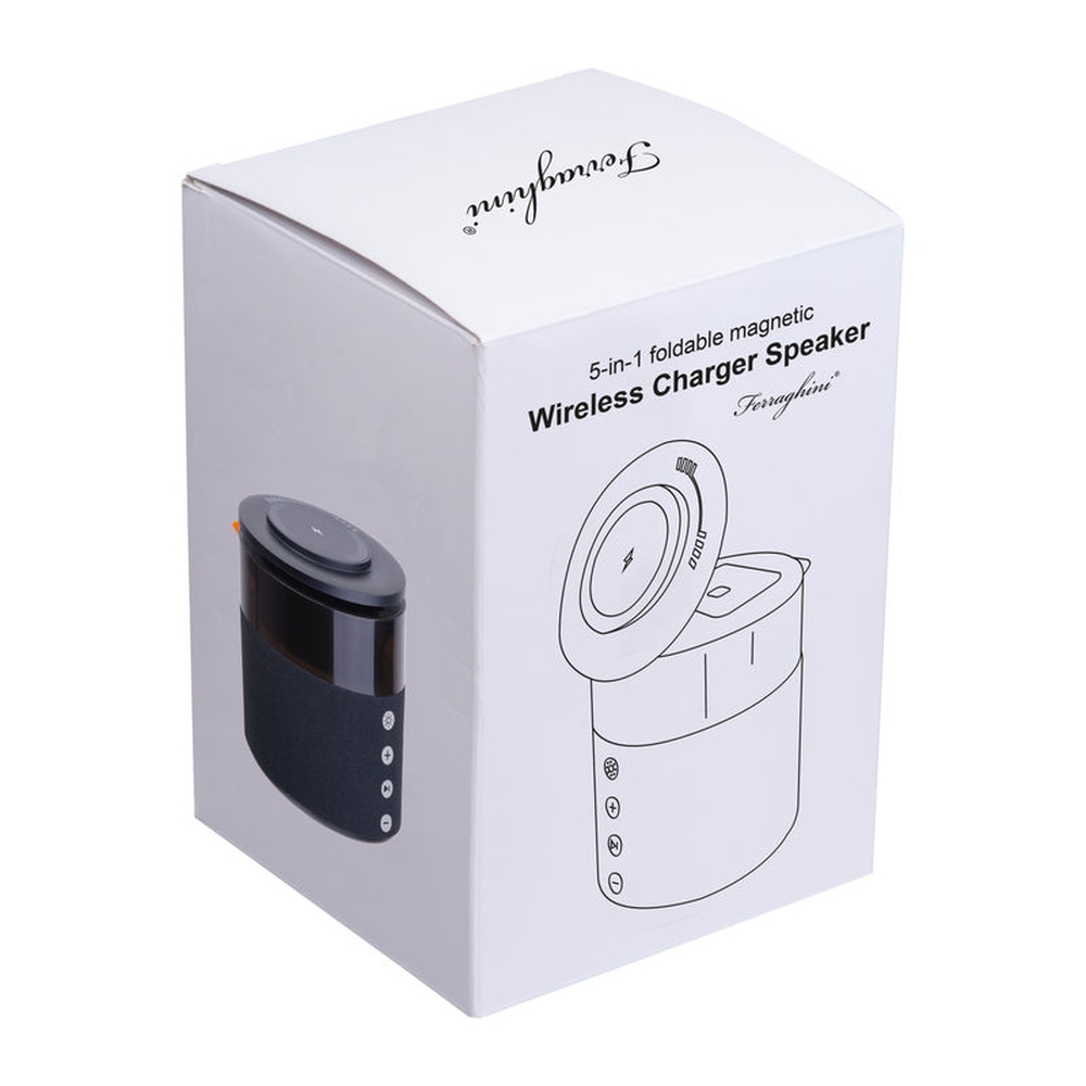 Reproduktor Ferraghini 5 v 1 s výkonem 5 W a rozhraním Bluetooth 5.4 s integrovanou bezdrátovou nabíječkou pro chytrý telefon, AirPods sluchátka a inteligentní Apple hodinky, dodávaný s kabelem USB-C. Provozní doba 4 – 6 hodín, s baterií s kapacitou 1800 mAh. Rozměry: o 9,4 x 14,5 cm