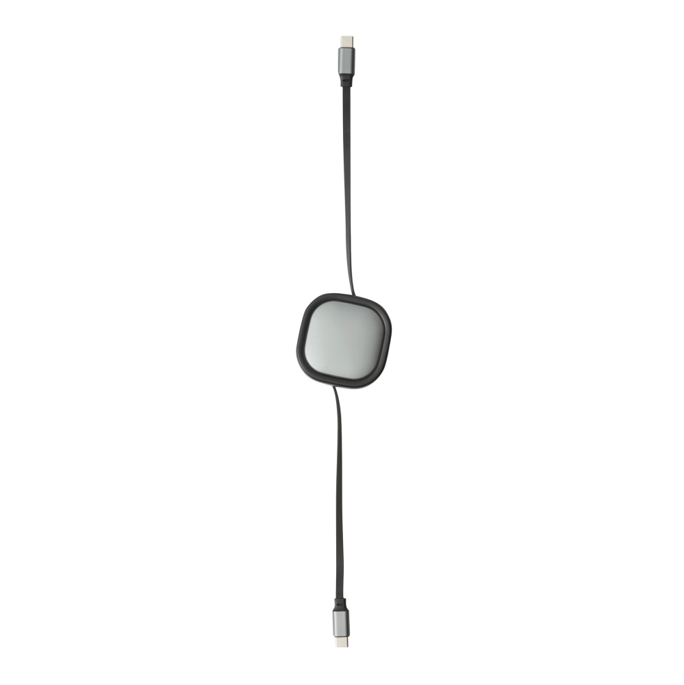 Nabíjecí a datový kabel C2C: zatahovací (délka: cca 90 cm), pro nabíjení chytrých telefonů, zařízení napájených přes USB a notebooků (výkon 60 W) a také pro přenos dat, obsahuje 2 nabíjecí konektory (USB typu C). Rozměry: 5,6 x 5,6 x 2,4 cm