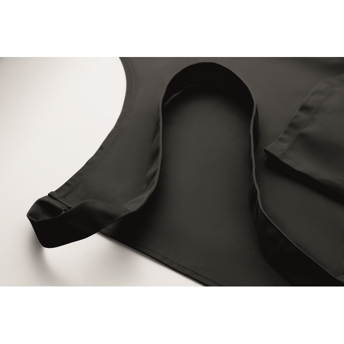 Dlouhá nastavitelná kuchyňská zástěra z polybavlny o gramáži 240 gr/m2 (35 % bavlna, 65 % polyester) se dvěma předními kapsami a nastavitelným popruhem s kovovou sponou. Rozměry: 75 x 90 cm