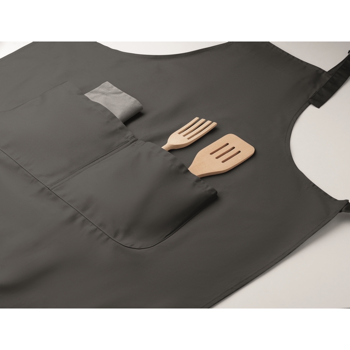 Dlouhá nastavitelná kuchyňská zástěra z polybavlny o gramáži 240 gr/m2 (35 % bavlna, 65 % polyester) se dvěma předními kapsami a nastavitelným popruhem s kovovou sponou. Rozměry: 75 x 90 cm