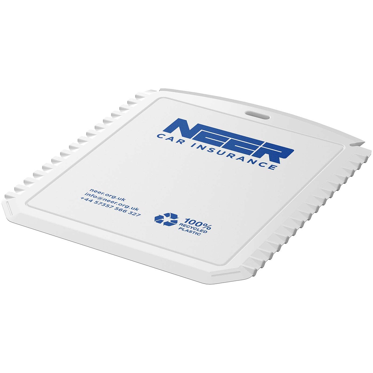 Kompaktní a praktická obdélníková škrabka na led z recyklovaného plastu je perfektním nástrojem pro použití v mrazivém počasí. Odolná konstrukce je vyrobena ze 100% recyklovaného plastu a zajišťuje účinné odstraňování ledu a námrazy. Má plochou hranu, zoubkovanou hranu a čistič stěračů čelního skla. Rozměry: 12 x 10 cm