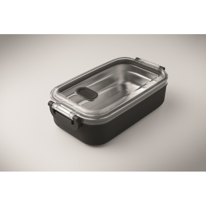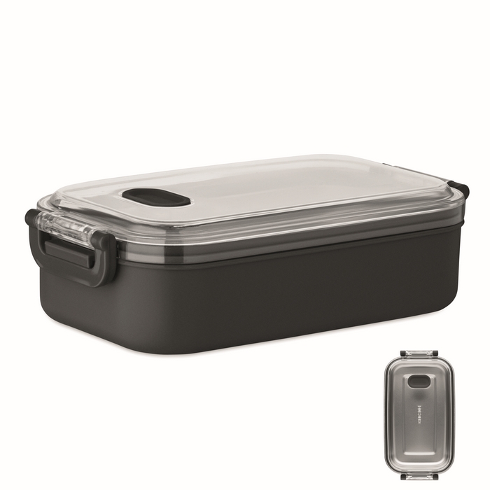 Obědový box z PP s přídavným zásobníkem z recykl. nerez. oceli. Vzduchotěsné AS víčko, které udrží potraviny čerstvé a bezpečné zavřené. Objem 750ml bez zásobníku a 650ml se zásobníkem. Rozměry: 21.6 x 12 x 6.5 cm