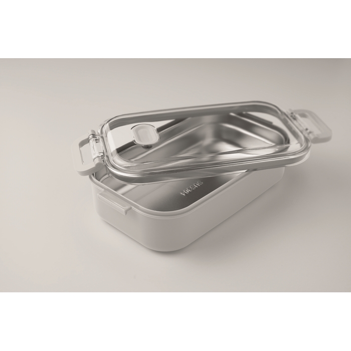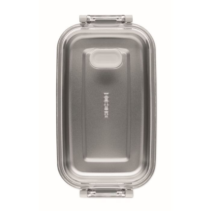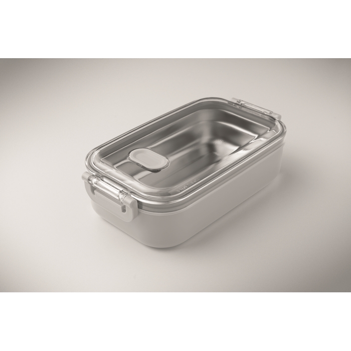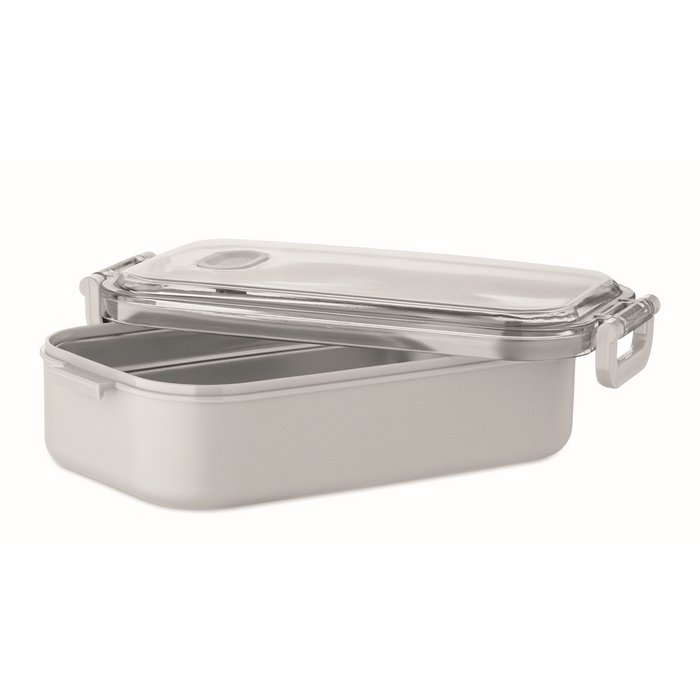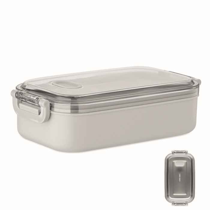 Obědový box z PP s přídavným zásobníkem z recykl. nerez. oceli. Vzduchotěsné AS víčko, které udrží potraviny čerstvé a bezpečné zavřené. Objem 750ml bez zásobníku a 650ml se zásobníkem. Rozměry: 21.6 x 12 x 6.5 cm