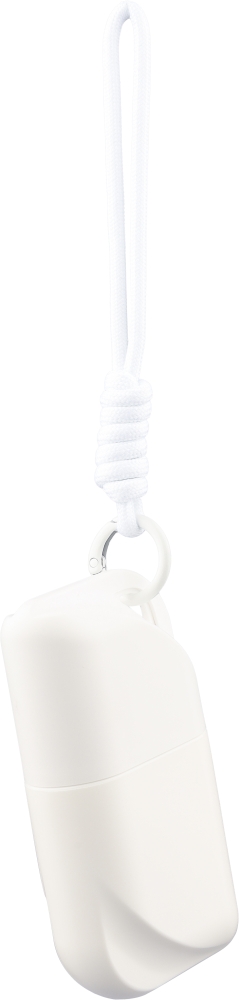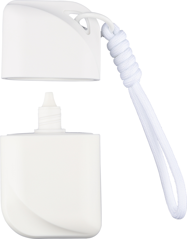 PP kazeta s 50ml opalovacím krémem (SPF50) a barevně sladěnou polyesterovou šňůrkou na zápěstí s kovovým háčkem. Na zadní straně je samolepka ve tvaru brožury. Rozměry: 2,5 cm x 10 cm