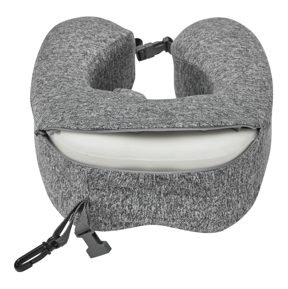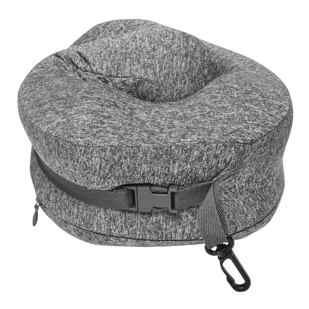 Krční polštář z paměťové pěny s integrovanou kapucí pro zakrytí hlavy a obličeje, s nastavitelným zapínáním na druk, odnímatelný a pratelný žerzejový potah, vyplněný paměťovou pěnou pro optimální pohodlí, poutko s malou karabinou pro zavěšení nebo připevnění během přepravy (karabina NENÍ vhodná pro lezení), krční polštář lze srolovat a zavřít na druk pro úsporu místa. Rozměry: 28 x 22 x 10 cm