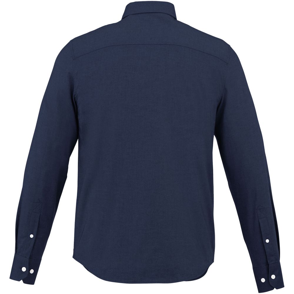 Pánská bavlněná košile s dlouhým rukávem, značka Elevate. Košile má límeček na knoflíčky, nastavitelné manžety s jedním záhybem, saténové lemování vnitřního výstřihu, gravírované perleťové knoflíčky. Druhá knoflíková dírka od spodního lemu je s oranžovým stehováním. Oxford 100% bavlna, 142 g/m2.