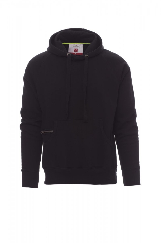 Pánská mikina s kapucí s dvojitým prošitím, bílá stahovací šňůrka se sladěným prošitím a s kovovými kroužky, raglánové rukávy, V-prošívání pod krkem, klokaní kapsa, kapsička na zip, manžety a pas s elastickým žebrováním, zesílené švy. Gramáž 300g/m2. Materilál 70% bavlna, 30% polyester.