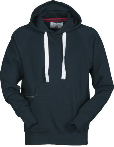 Pánská mikina s kapucí s dvojitým prošitím, bílá stahovací šňůrka se sladěným prošitím a s kovovými kroužky, raglánové rukávy, V-prošívání pod krkem, klokaní kapsa, kapsička na zip, manžety a pas s elastickým žebrováním, zesílené švy. Gramáž 300g/m2. Materilál 70% bavlna, 30% polyester.