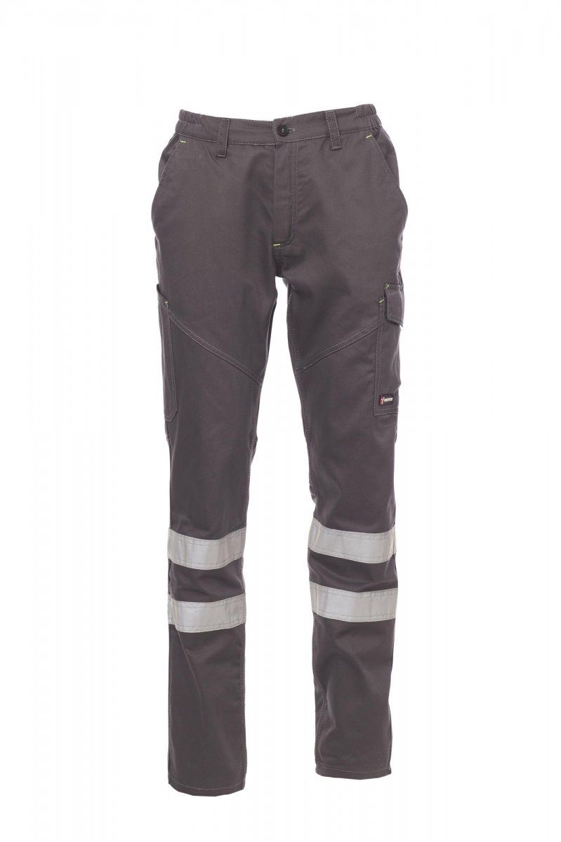 Unisexové kalhoty s reflexními pruhy kat.1. V pase mají kalhoty elastické pásky na bocích a poutka a zapínání na plastový zip a na kovový knoflík. Dále mají dvě přední kapsy klasického střihu, jedna postranní kapsu se zapínáním, jednu kapsu na svinovací metr, dvě postranní kapsy, z nichž jedna otevřená a druhá s klopou na suchý zip, kontrastní vsadky a prošití, reflexní pruhy na zadní kapse, trojí prošití. Kalhoty jsou ušity ze 100% bavlny, 260g. Velikosti: XS–5XL
