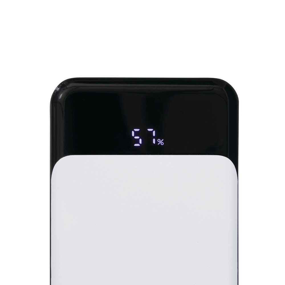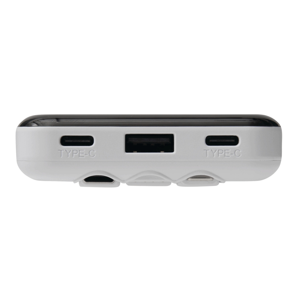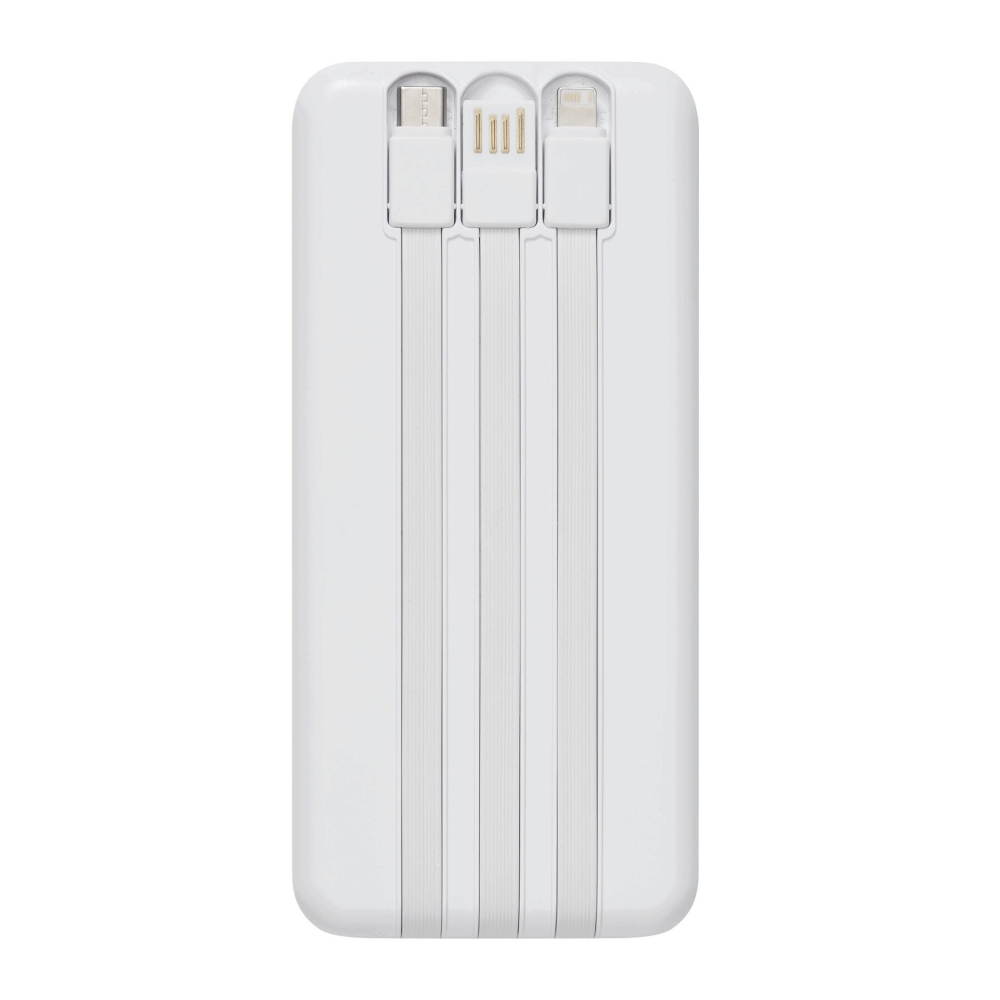 Powerbanka vhodná pro chytré telefony a zařízení připojená přes USB, obsahuje 3 integrované nabíjecí kabely na zadní straně (USB Type-C, Lightning, USB Type-A), indikátor stavu baterie v procentech, vypínač, 2 vstupní/výstupní porty USB Type-C a 1 výstup USB Type-A, vstup: 5V/2A, výstup: 5V/2A (max.), kapacita: 10 000 mAh, vysoce výkonná lithiová baterie, baleno v dárkové krabičce. Rozměry: 14,5 x 6,8 x 1,8 cm